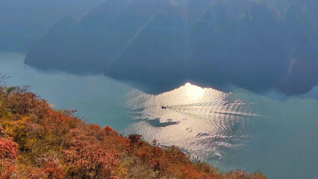 站在三峡之巅是什么体验?🌄立于三峡龙脊,俯身望去,千米之下的江面细若银练,轮船如一枚枚精致的刀片,缓慢而坚定地切开水面,留下无声的航迹。阳光铺满了整个巫峡,连绵的山脉沉淀为一种深沉的苍蓝,江面则碎裂成万千亮晶,粼粼闪烁。 🍁而最灼目的,是那浸透阳光的红叶,一簇簇、一重重,在苍蓝与亮晶之间,像打翻的调色盘,热烈又温柔。