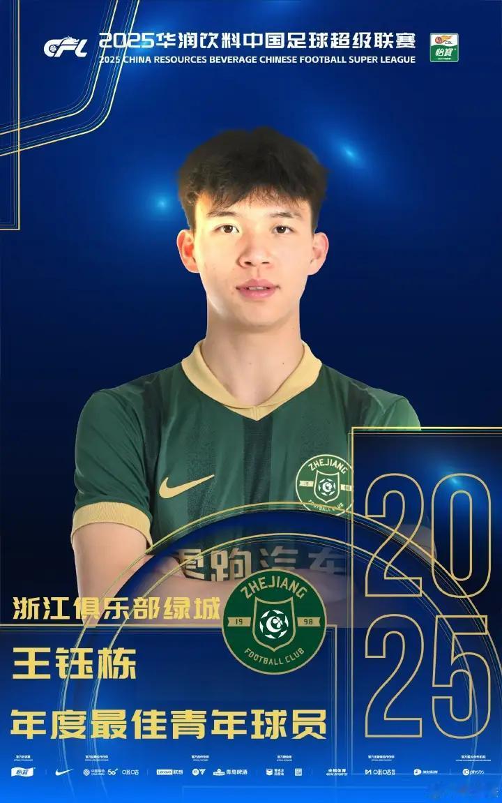 王钰栋荣膺本赛季中超最佳青年球员,跟预想的一样,19岁王钰栋获奖实至名归,王钰栋拿下2025中超本土射手王,进11球+5次助攻,在中国国家队18强赛进1球,在中国U22国青亚洲杯预选赛打进4球2次助攻;在中国U20国青亚洲杯打进1球1次助攻,2个制造点球,王钰栋已经成各级国家队主力核心,19岁王钰栋获奖真的是货真价实。 重庆铜梁龙球员张志雄获得中甲最佳青年球员,中甲打进5球3次助攻,助重庆铜梁龙冲超成功,张志雄也是19岁,表现神勇,获奖也在情理之中。