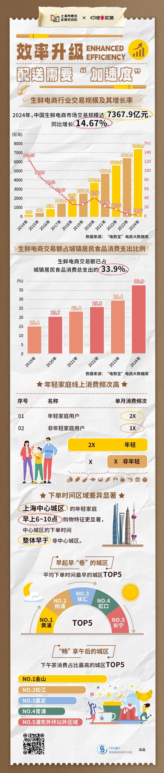 随着数字基础设施的完善与即时零售的崛起,传统的“菜场采购”正加速向“指尖下单”迁移。公开数据显示,2024年中国生鲜电商市场交易规模达7367.9亿元,同比增长14.67%。生鲜电商交易额已占城镇居民食品消费总支出的33.9%,接近三分之一家庭的饭碗开支正通过“指尖下单”完成。线上生鲜消费,已成为上海年轻家庭的常态模式。