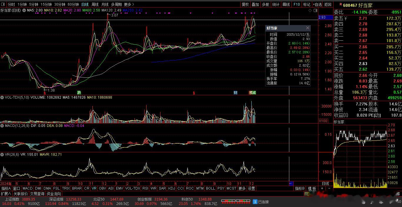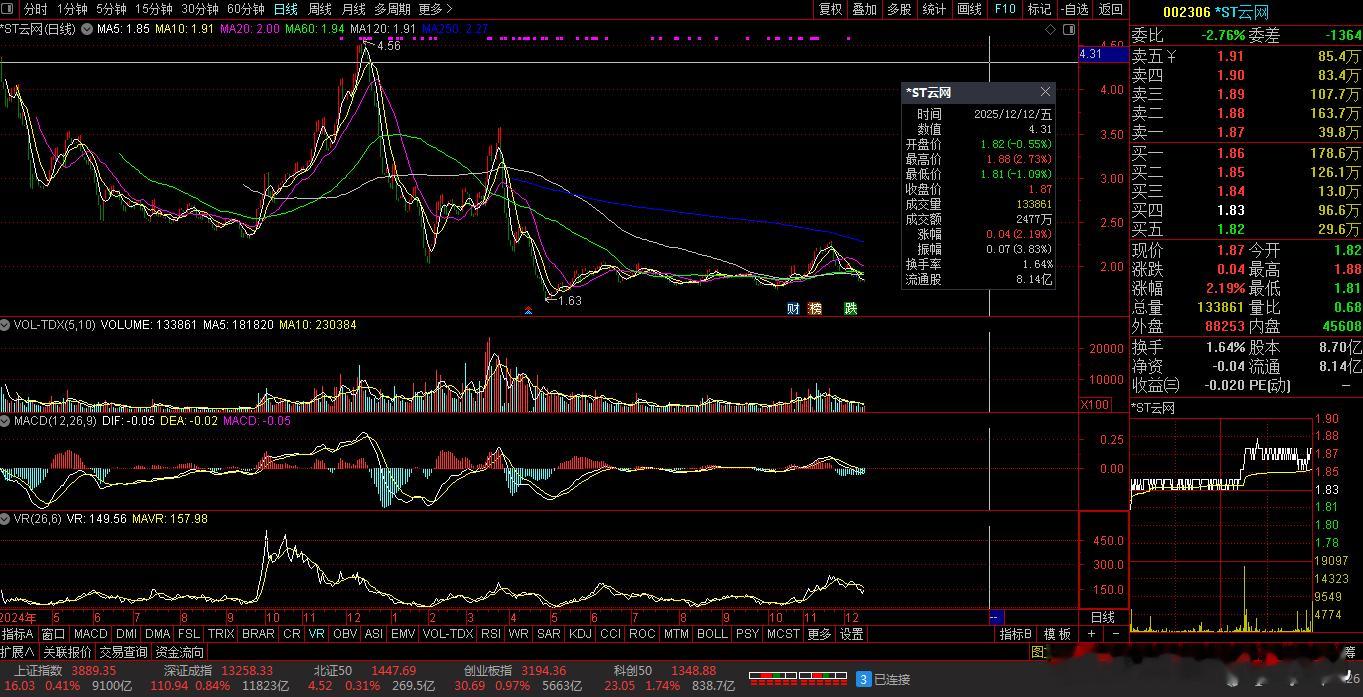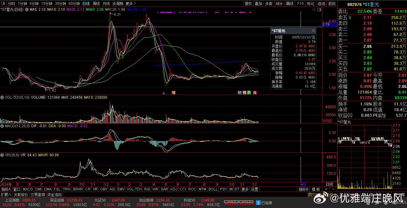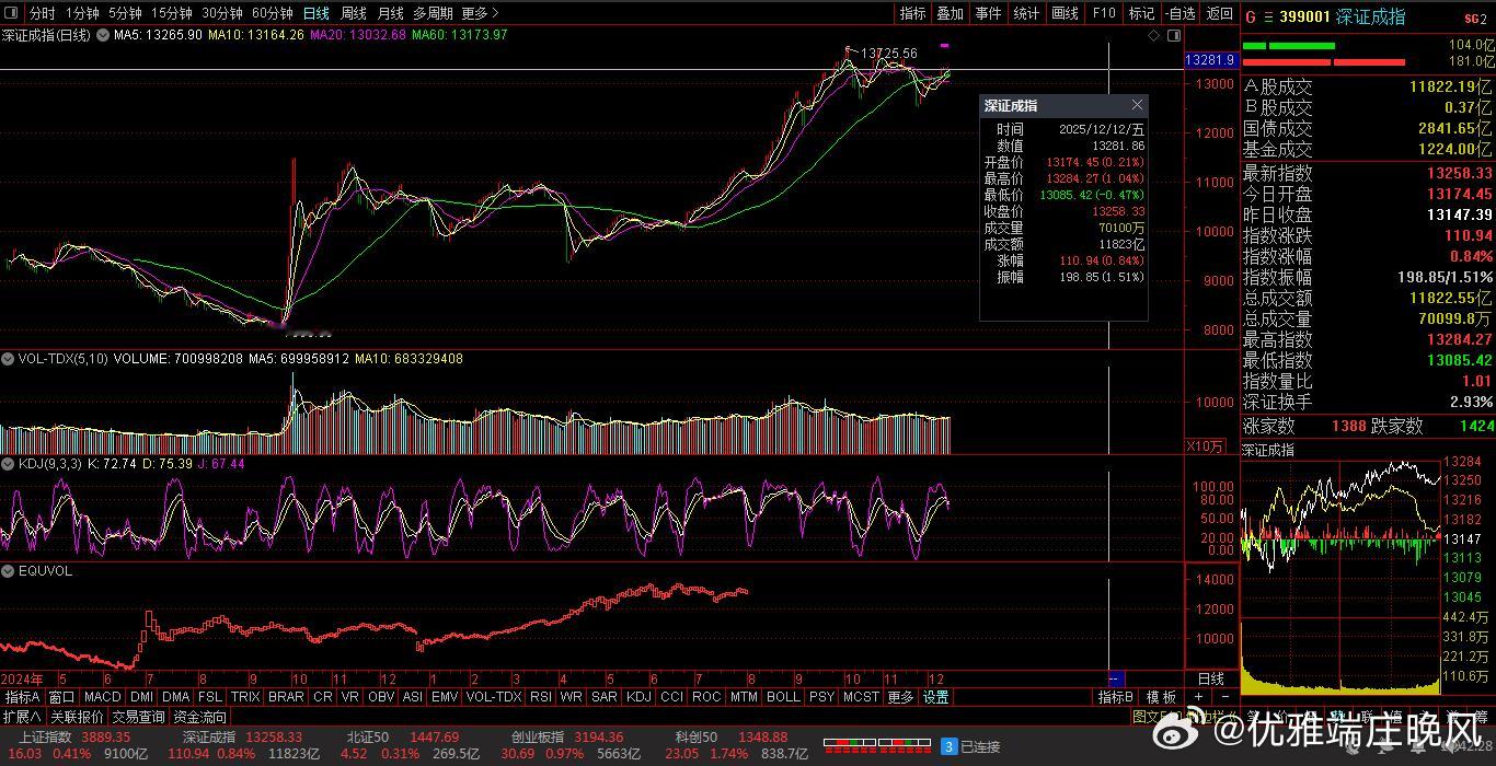 【财富晚茶】三元股市收评:沪指涨0.41%:养殖强势上扬体育探底导语:作者系《网易号》优质财经领域创作者。曾经原创作者和知名网易号旅游领域创作者。大跨度行业等的写作,颇受网友喜爱。作品发表于2025.12.12.15:18优雅端庄晚风。(标题作品:全球最佳养殖场:美国夏威夷:古兰尼牧场:ATV探险必打卡活动)一、*ST星光:八年箱底002076 *ST星光 盘中-01涨1、八年筑底:底部震荡今日视野:前期双底,窄幅震荡。2025-12-12 截止15:00:收盘股价:2.07元,上涨0.49%。成交总量:121064手。成交金额:2516万元。总换手率:1.16%。总市值达:21.58亿元,流通市值:21.58元。2、汽车照明:锂电设备主营业务:LED照明-紫外消杀-汽车照明-锂电池生产设备研产和销售。公司品牌:光科技应用-锂电池头部企业。3、营收良好:净利减亏业绩盈亏:2025-09-30 三季度报:公司营收:1.6865亿 同比增36.04%,实现净利润320.2526万 同比增256.29%。二、多空搏杀:沪深红盘1、追踪盘面:蛛丝马迹沪深场景:早盘:沪指:低开三跌,五涨一跌。深指:高开三跌,五涨一跌。午盘:三涨二跌,二涨三跌。尾盘:探底二涨,次高红盘。看点之一:两市股指:午后强势:瞬间拉升。看点之二:创指强势:涨幅近1%。科创50指:涨幅近2%。看点之三:沪深北市:合计成交:21193亿元。场内个股:2683股飘红。2、板块涨跌:风口依然涨跌观察:板块见证:板块上涨:养殖、半导体等。板块上扬:保险、电力、券商等。板块走低:体育、零售、地产、银行、医药等。概念活跃:核电、特高压、商业航天等。3、技术看盘:涨跌位置观K线提示:精彩多空博弈。12月12日:沪指突破阻力:03904点看涨,前程似锦;跌破支撑位:03862点看跌,日暮途穷。深指突破阻力:13388点看涨,鹏程万里;跌破支撑位:13147点看跌,不堪造就。三、三元板块:风口潜水1、追踪盘面:视角视野三元弱势,沪深强势。33股上涨,涨幅5%以上:0股涨停板。77股下跌,跌幅5%以上:8股跌停板。涨幅0%:20股0停板。涨幅0.00%+上涨个股:20+33=53股票赚钱。沪深两市:合计成交21193亿元。总体归纳:三元股票:盘口弱势。2、追踪盘面:主力进退换位思考:沪深强势,尾盘抢筹。沪指距9:31-15:00:前1小时放量盘跌,中2小时略量盘升,后1小时略量盘升。深指距9:31-15:00:前1小时放量盘跌,中2小时略量盘升,后1小时略量盘跌。沪深两市:合计成交:21193亿元。四、透析个股:聚焦涨跌1、涨幅榜眼:处排查摸主旋律:涨幅榜之中:寻找启动600726 华电能源002306 *ST云网涨幅榜-1:600726 华电能源主营业务:电力生产-电力技术服务研产和销售。公司品牌:世界一流能源企业。涨幅榜-2:002306 *ST云网主营业务:餐饮团膳-互联网游戏研产和销售。公司品牌:餐饮团膳和新能源光伏领先企业。涨幅榜-3:600467 好当家主营业务:海产-冷冻食品等研产和销售。公司品牌:名优特水产生态化养殖头部企业。2、跌幅榜眼:处排查摸主旋律:跌幅榜之中:寻找金子300344 *ST立方 600200 退市苏吴 601828 美凯龙跌幅榜-1:300344 *ST立方主营业务:智能软硬件-数字化智能-数字智能服务等研产和销售。公司品牌:新型数字基础建设的数字科技云服务商。跌幅榜-2:600200 退市苏吴主营业务:退市。公司品牌:退市标的。跌幅榜-3:601828 美凯龙主营业务:家居装饰-家具商场经营等研产和销售。公司品牌:国内领先家居装饰及家具商场运营商和泛家居业务平台服务商。3、潜力榜眼:处排查摸主营业务:家居装饰-家具商场经营等研产和销售。公司品牌:国内领先家居装饰及家具商场运营商和泛家居业务平台服务商。排查摸主旋律:潜力榜之中:寻找估值002496 *ST辉丰 300301 *ST长方 000669 ST金鸿潜力榜-1:002496 *ST辉丰主营业务:生物农资-农资电商-石化仓储供应链-项目投资。公司品牌:中国领先亚临界小分子高温裂解工艺高科技专利产品和头部企业。潜力榜-2:300301 *ST长方主营业务:LED照明光源器件。公司品牌:LED照明光源器件头部企业。潜力榜-3:000669 ST金鸿主营业务:天然气。公司品牌:国内最具实力的综合性清洁能源服务商。五、本创作者:优质网易投资投机迷茫之中:给予尽可能有帮助:资本市场风险自负。(优雅端庄晚风《网易号》优质财经领域创作者和原创作者; 违者必究)