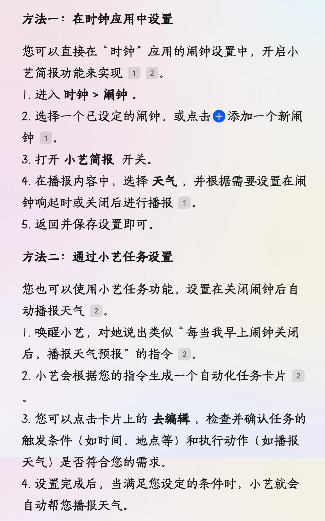 给大家分享鸿蒙6中三个与闹钟有关的实用小技巧。 早上的闹钟,设置闹钟响起即播报当天“天气预报”,起床即可知道今天该穿什么衣服,需不需要带雨具,非常贴心。 中午的闹钟,设置闹钟响了即播报“每日要闻”,刷牙洗脸时间即可知晓过去一天国内外大事。 最后一个既是日常提醒功能,日常生活中有什么事情怕忘记,可以让小艺帮忙提醒,时间一到,闹钟便响起,不再怕错过重要事项,非常方便。 这就是本人在日常中使用最多的闹钟功能,大家也可以试一试,不知道怎么设置,问一问小艺即可!