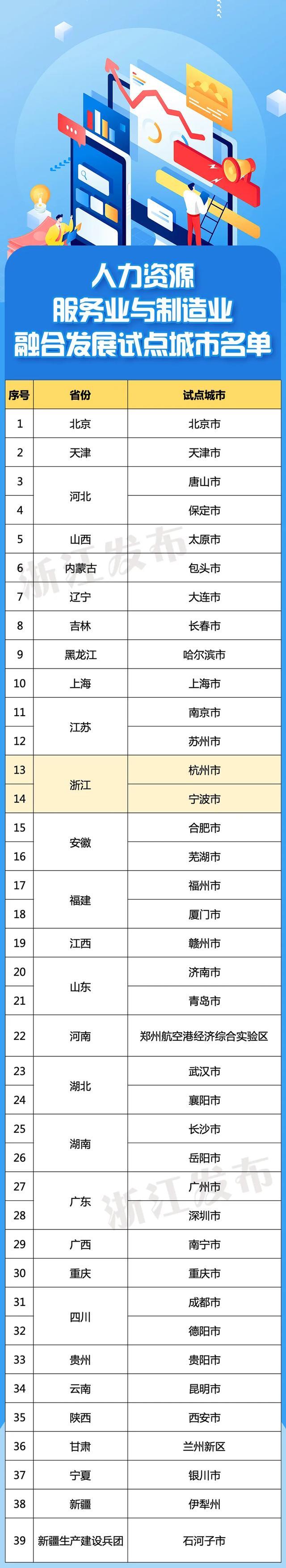 近日,人力资源社会保障部办公厅印发《关于做好人力资源服务业与制造业融合发展试点有关工作的通知》,部署开展人力资源服务业与制造业融合发展试点工作,确定北京、天津、唐山等39个试点城市。其中,浙江的杭州、宁波入选。