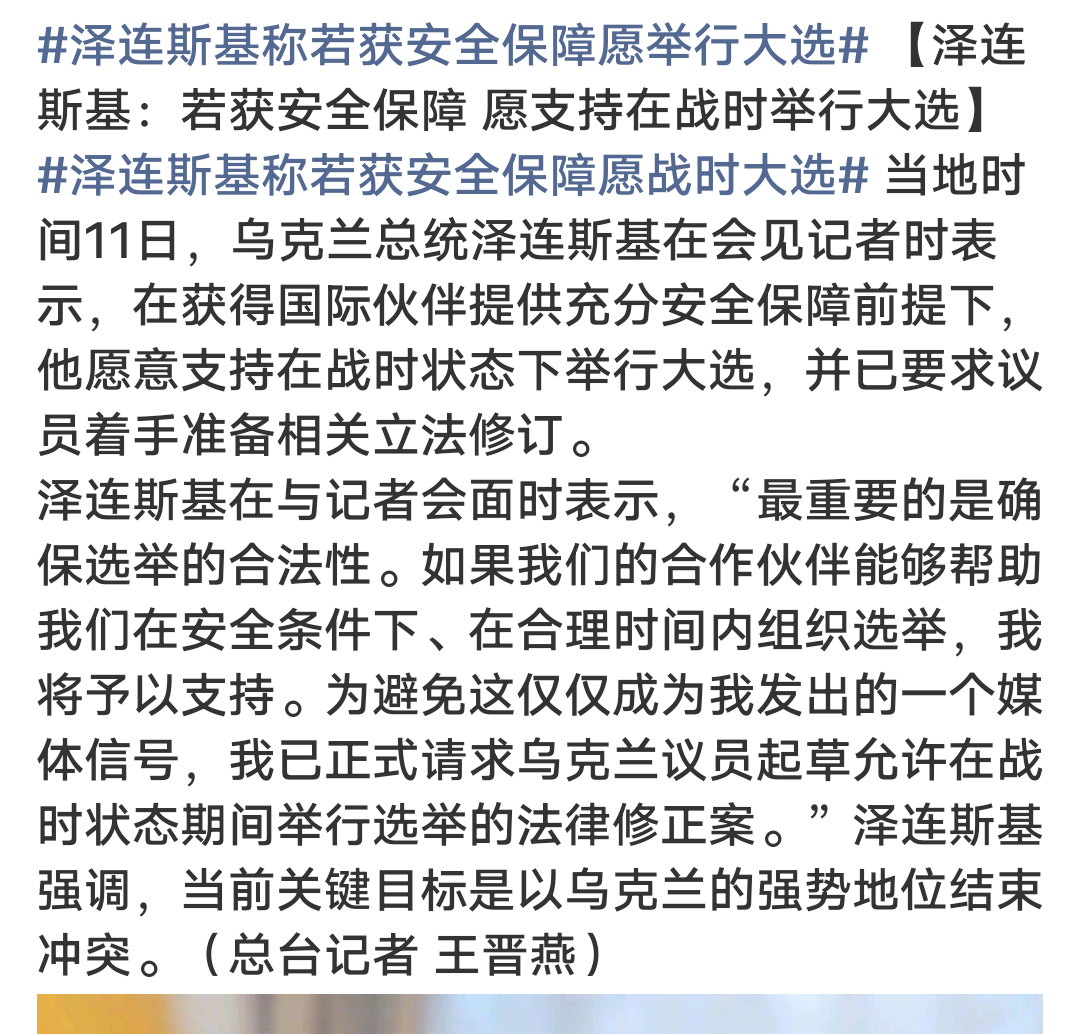 泽连斯基称若获安全保障愿举行大选★:泽连斯无疑受到了内外部的压力试图进行选举,但