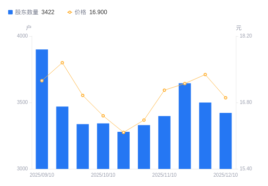 日期A股户数(户)流通A股户均持股数(股)户均持股市值(万元)2025-12-10342222825.7238.582025-11-28350022317.0338.812025-11-20364521429.2536.862025-11-10339822986.9439.222025-10-31333023456.3438.542025-10-20327914361.9823.222025-10-10334314087.0223.272025-09-30333714112.3523.922025-09-19347013571.4523.942025-09-10390012075.1120.84