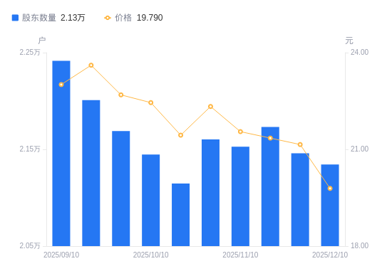 日期A股户数(户)流通A股户均持股数(股)户均持股市值(万元)2025-12-102134315425.6730.532025-11-282145915342.2832.452025-11-202173215149.5532.342025-11-102152815293.1132.962025-10-312160315240.0134.032025-10-202114715568.6433.382025-10-102144715350.8734.462025-09-302168915179.5834.442025-09-192201014958.2035.322025-09-102241614687.2833.80