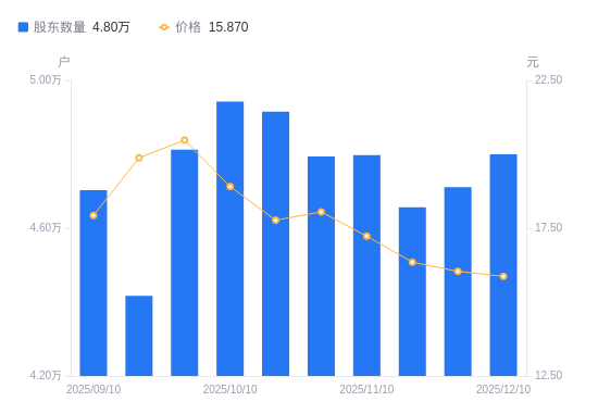 日期A股户数(户)流通A股户均持股数(股)户均持股市值(万元)2025-12-104800011026.6717.502025-11-284711011234.9918.022025-11-204656911365.5118.582025-11-104798111031.0419.012025-10-314794011040.4719.932025-10-204915710767.1419.132025-10-104942310709.1920.252025-09-304812310998.4922.522025-09-194416611983.8923.822025-09-104703111253.8620.18
