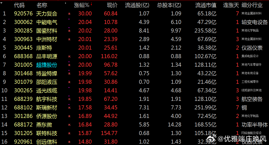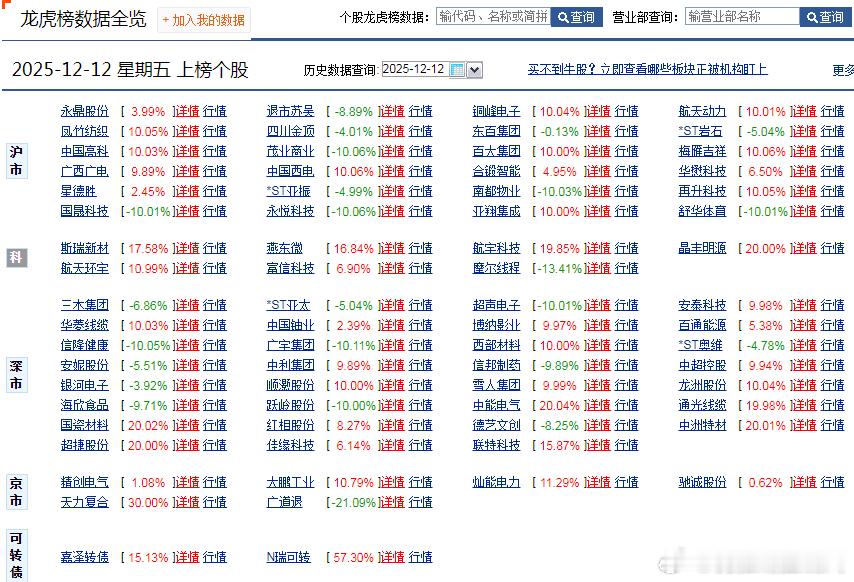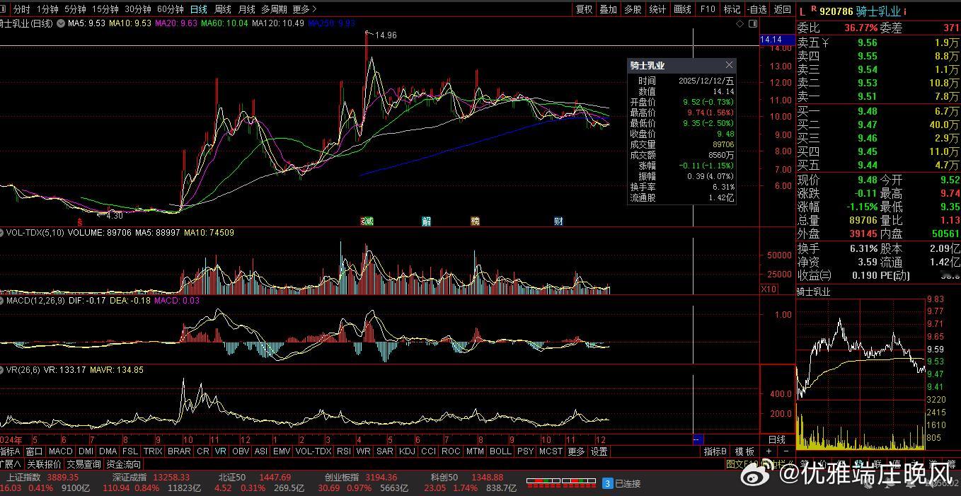 【财富晚茶】今日股市收评:深指涨0.84%:影视震荡回升食品杀跌导语:作者系《网易号》优质财经领域创作者。曾经原创作者和知名网易号旅游领域创作者。大跨度行业等的写作,颇受网友喜爱。作品发表于2025.12.12.15:18优雅端庄晚风。(标题作品:全球票房第二名:《疯狂动物城2》)一、视野焦点:恰似“火眼金睛”920786 骑士乳业 盘中-01涨1、突破三年箱顶视野盘面:前期三顶:杀跌过度。2025-12-12 截至15:00:股价报收:9.48元。该股上涨-1.15%。成交总量:89706手,成交金额:8560万元。总换手率6.31%,观总市值:19.82亿元。流通市值:13.48亿元。2、牧草奶牛翘楚主营业务:牧草种植-牛场运营-奶牛集约化养殖-优质生鲜乳供应的研产和销售。公司品牌:全产业链乳制品综合供应商和头部企业。3、经营优良企业财报透视:2025-09-30 三季度报:公司营收:9.1353亿 同比增24.01%。公司净利:3909.7136万 同比增281.30%。二、多方强势:恰似“弱肉强食”1、博弈追踪盘面第一、沪深盘面透析沪深回放:跌宕起伏。早盘:沪指:低开三跌,五涨一跌。深指:高开三跌,五涨一跌。午盘:三涨二跌,二涨三跌。尾盘:探底二涨,次高红盘。第二、透析沪深指数追寻沪深:跌宕起伏。沪指涨0.41%(016.03点),报03889.35点,成交额09100亿。深指涨0.84%(110.94点),报13258.33点,成交额11823亿。创指涨0.97%(030.69点),报03194.36点,成交额05663亿。北指涨0.31%(004.52点),报01447.69点,成交额00269亿。沪深北市:合计成交:21193亿元。2、复盘沪深个股第一、今日个股视野今日观察:涨跌互动。2683股上涨,106个股涨停板。2610股下跌,23跌停板。沪深北市:合计成交21193亿元。三、沪深阳棒:恰似“阳春白雪”1、洞察机构尾盘主旋律:沪深强势,尾盘拉抬。沪指距9:31-15:00:前1小时放量盘跌,中2小时略量盘升,后1小时略量盘升。深指距9:31-15:00:前1小时放量盘跌,中2小时略量盘升,后1小时略量盘跌。沪深两市:合计成交:21193亿元。四、资金流向:恰似“水落石出”1、目击主力资金Wind统计显示:主力资金全天净流出净流出48.72亿元。其中,创业板主力资金净流出34.36亿元,沪深300成份股主力资金净流出73.32亿元,科创板主力资金净流出39.30亿元。所属的31个一级行业,今日有14个行业主力资金呈现净流入,其中,电力设备行业主力资金净流入最多,净流入金额为28.05亿元;行业主力资金净流入居前:机械设备、公用事业、有色金属、非银金融等。26行业主力资金呈现净流出,其中,电子行业主力资金净流出最多,净流出金额为:135.86亿元;行业主力资金净流出靠前:计算机、基础化工、商贸零售和医药生物等。2、龙虎榜晴雨表收盘龙虎榜数据:机构席位资金合计:净买入约3.4亿元。其中,净买入的个股18只,净卖出的个股24只。机构净买入最多:国瓷材料:净买入额达1.53亿元;机构净买入居前:中能电气、永鼎股份等股。机构净卖出最多:永辉超市,净卖出额达11.94亿元;机构净卖出居前:航宇科技、西部材料、顺灏股份等股。3、涨停板跌停板第一、板块涨停上涨板块:其它发电设备、可控核聚变、电网设备、林业、贵金属等。下跌板块:一般零售、体育、免税概念、科创板次新、房产服务等。第二、个股涨跌沪深个股:涨多跌少,多方强势,略胜一筹。其中,2683股上涨,106个股涨停板。2610股下跌,23跌停板。沪深北市:合计成交21193亿元。4、明天趋势先知第一、沪指预测12月15日:沪指突破阻力:03891点看涨,前程似锦;跌破支撑位:03850点看跌,日暮途穷。第二、深指预测12月15日:深指突破阻力:13284点看涨,鹏程万里;跌破支撑位:13085点看跌,不堪造就。五、本创作者:恰似“优质网易”投资投机迷茫之中:给予尽可能有帮助:资本市场风险自负。(优雅端庄晚风《网易号》优质财经领域创作者和原创作者; 违者必究)