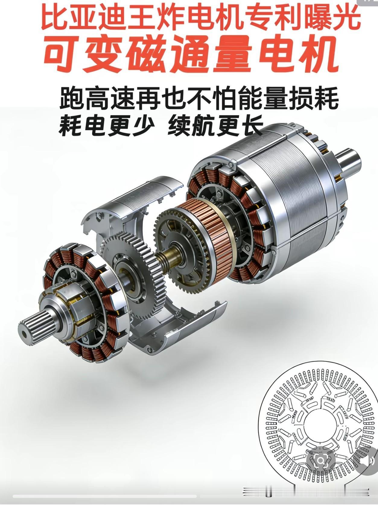 传统永磁同步电机,就像一台只有一个固定档位的发动机。起步有劲,中速高效,但一旦冲上高速,就只能靠‘硬扛’——转速越高,磁场越强,反电动势越大,电流进不去,效率自然掉下来。结果就是:低速省电,高速耗电。这不是电机偷懒,这是它的物理天性。 而比亚迪的可变磁通量电机,做了一件事:它给电机装上了‘磁场的变速箱。 这不是机械齿轮,而是通过电控系统,实时调节电机内部的磁通强度。需要大力爬坡时,‘挂低档’——增强磁场,扭矩拉满。需要高速巡航时,‘升高档’——减弱磁场,突破转速限制,同时让电流依然顺畅注入。 于是,电机从此有了‘工作区间’:低速档、高速档、经济档……它自己根据车速、路况、你的踏板深浅,无声切换。目的只有一个:让电机始终运行在最高效的那个‘档位’上。”