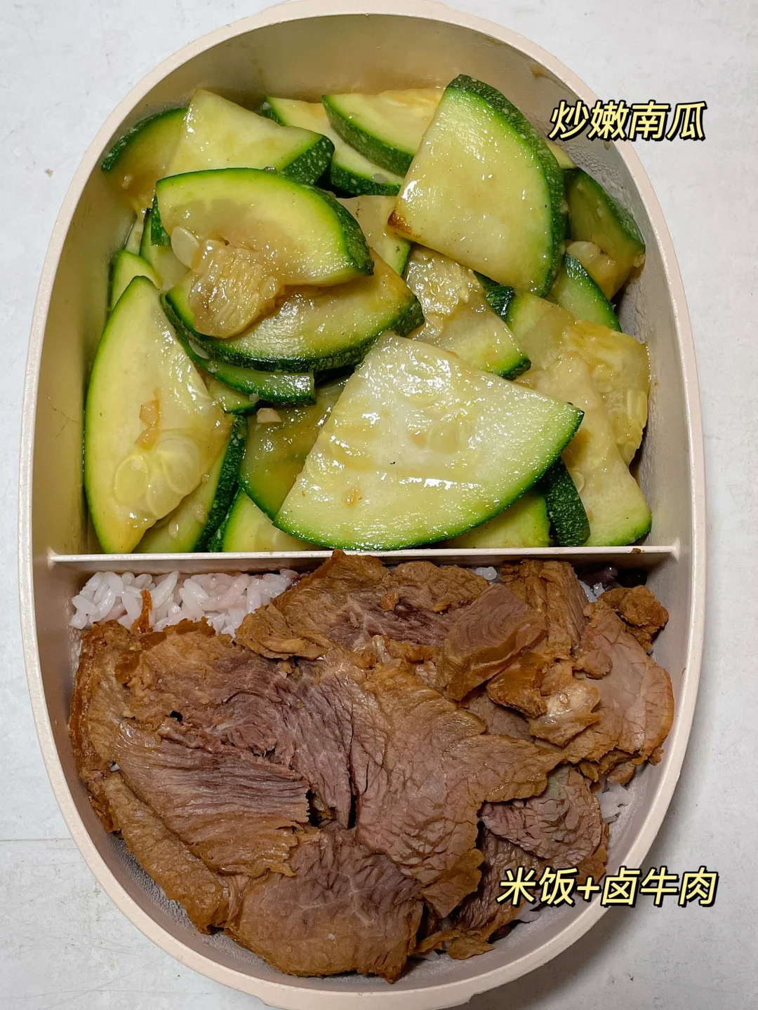 📍米饭+卤牛肉+炒嫩南瓜片