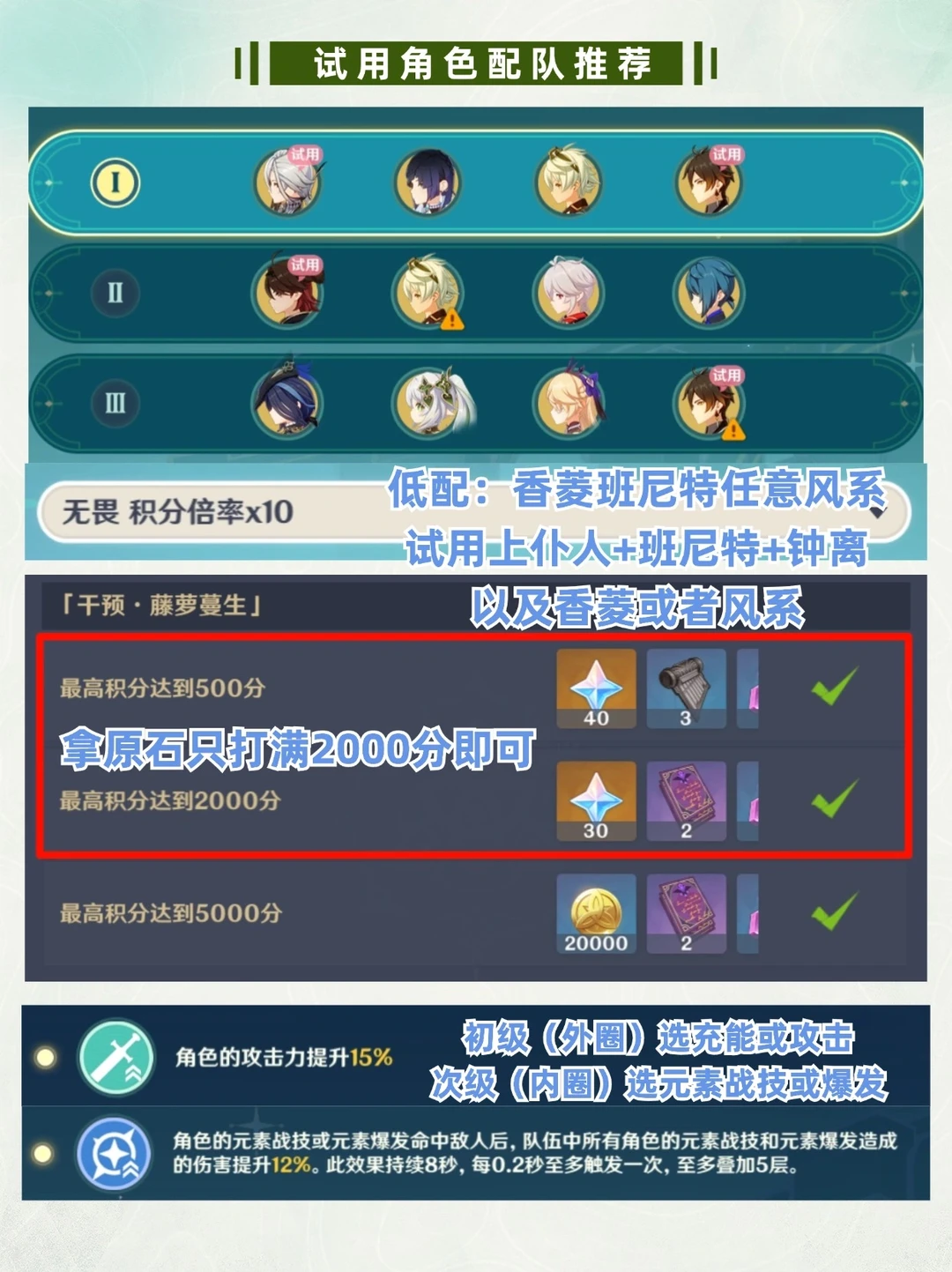 推荐配队: 低配:输出角色+香菱+班尼特+任意风系角色 高配: 1⃣️阿蕾奇诺+夜兰+班尼特+钟离 2⃣️嘉明+班尼特+万叶+行秋 3⃣️克洛琳德+纳西妲+菲谢尔+钟离 推荐效应器: 初级(外圈)选充能或攻击 次级(内圈)选元素战技或爆发