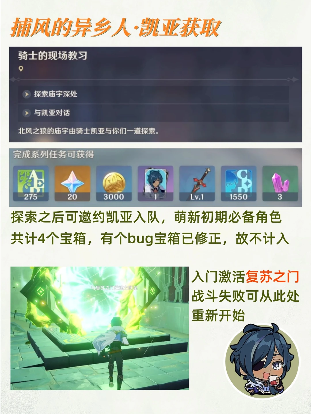 蒙德萌新向任务狼之殿攻略来啦![飞吻R] 位于捕风的异乡人-骑士的现场教习任务中 可邀约凯亚入队和并获得4个宝箱 本攻略由天空岛攻略组原创,未经许可,请勿转载