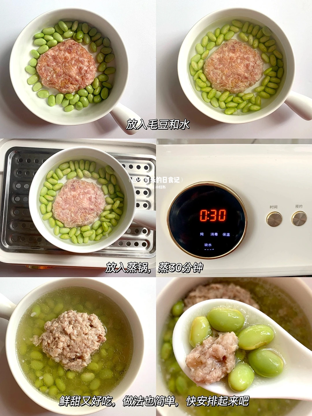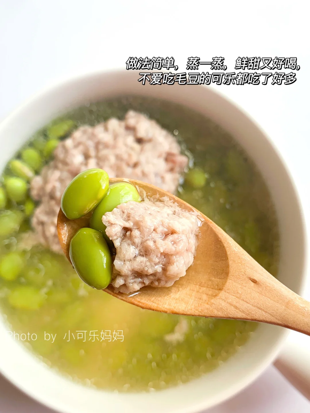 家里有爱喝汤的宝宝,老母亲每天都会给安排上,今天分享这款超鲜美的汤,毛豆搭配猪肉,蒸出来的汤真的很鲜甜,做法也很简单,肉饼蒸出来一点也不柴[赞R] - 🌟食材: 毛豆 猪肉 . 🌟做法 1⃣️猪肉末加入淀粉和少许酱油,抓拌均匀,手蘸水整理成饼状 2⃣️放入碗里,放入毛豆,加入适量清水 3⃣️上锅蒸30分钟即可,加点盐调味 -
