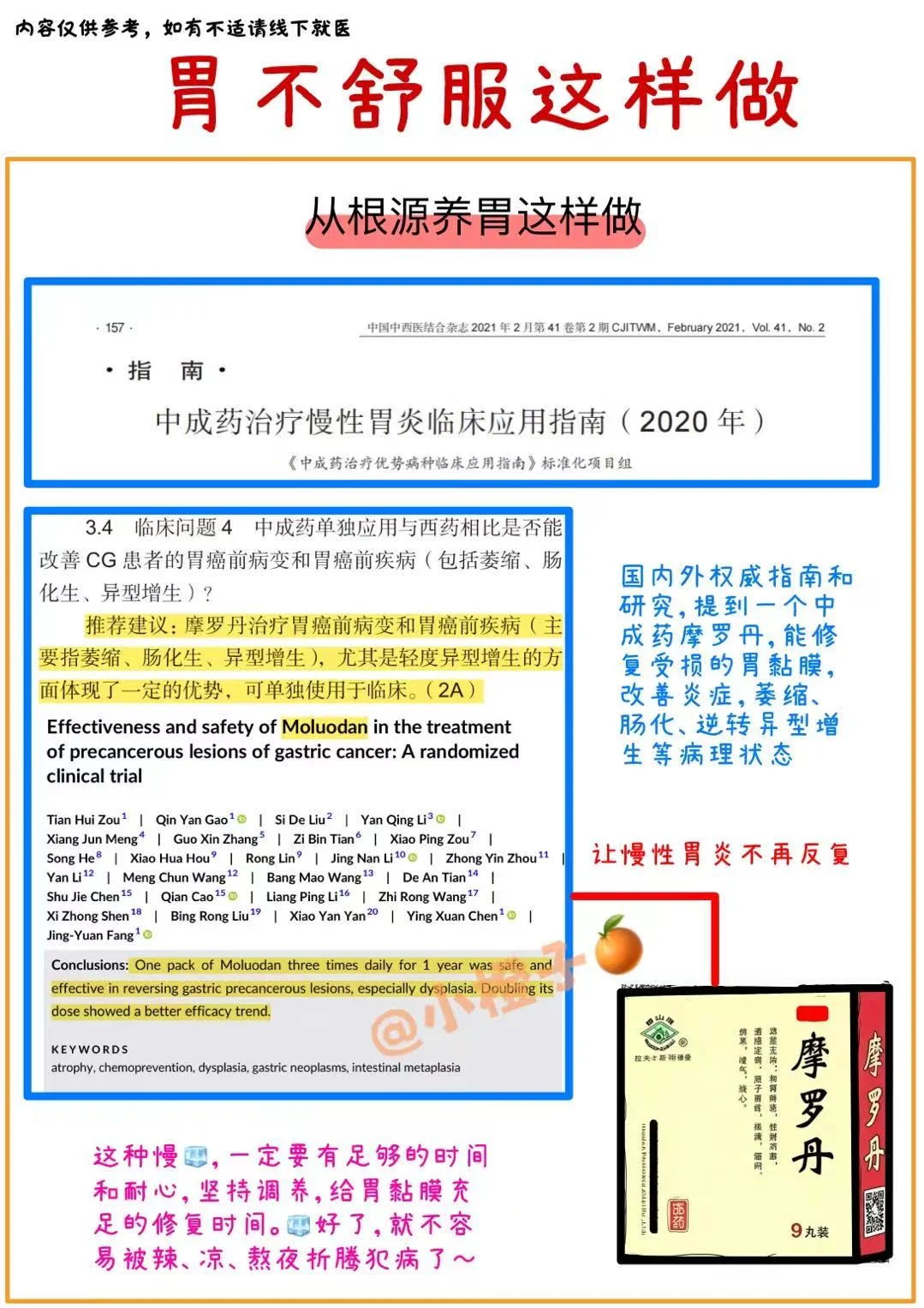 小橙子翻阅了国内外权威指南和研究,发现总是提到一个中成药摩罗丹,能修复受损胃黏膜,改善炎症,萎缩、肠化、逆转异型增生等病理状态。胃黏膜好了,胃痛、胃胀这些反复的老毛病也就跟着好啦~