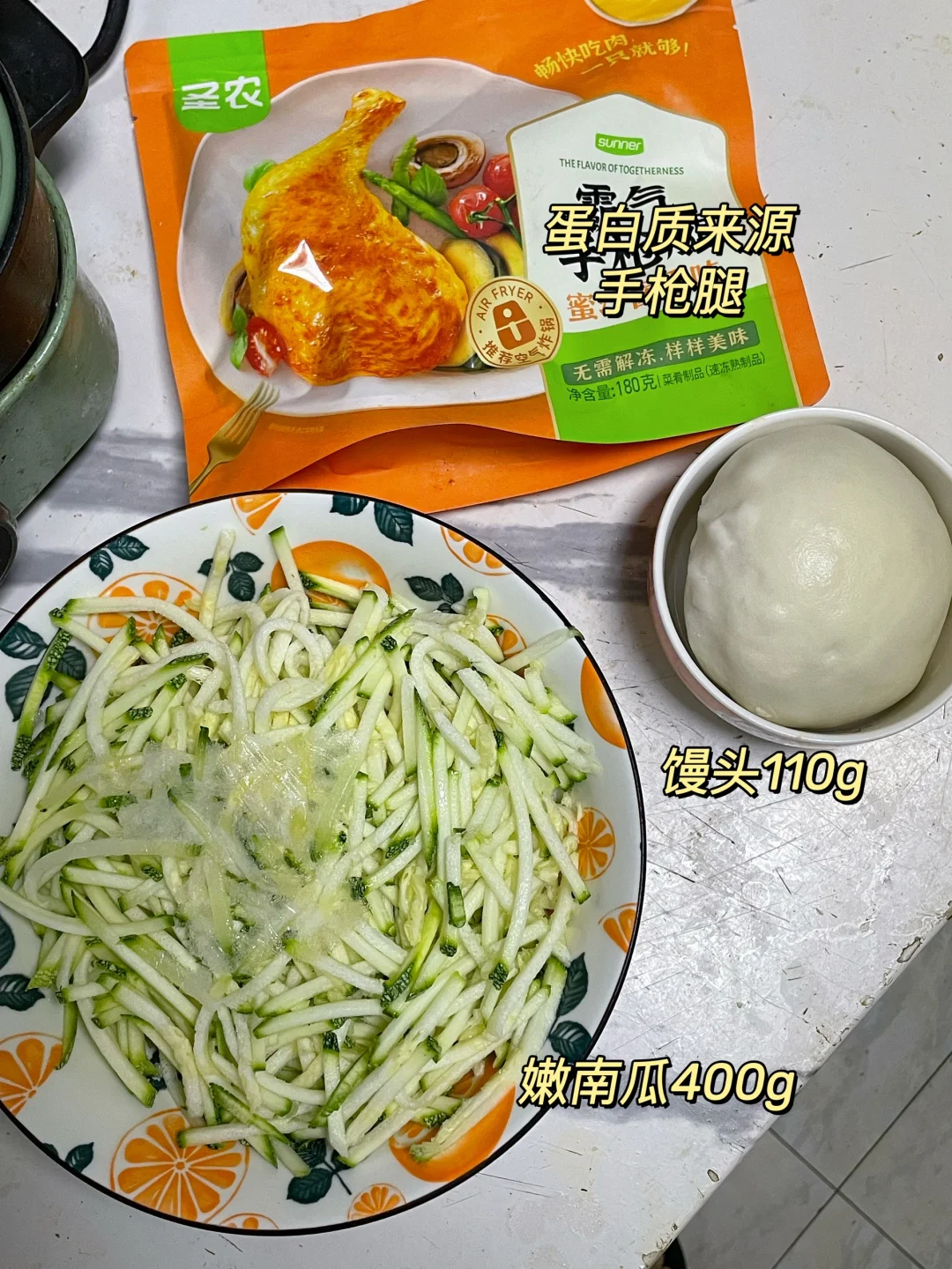 午 馒头+炒嫩南瓜丝+烤鸡腿