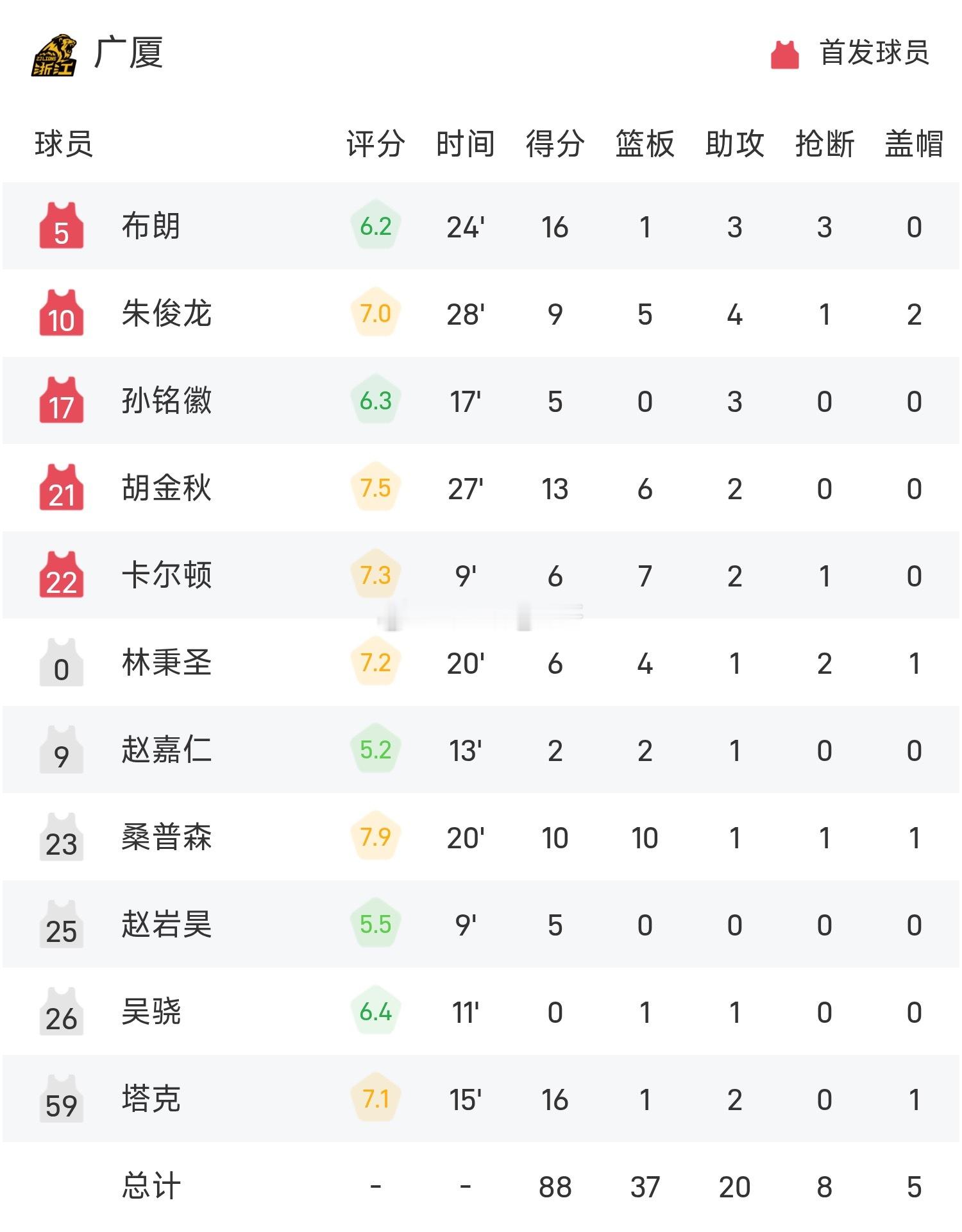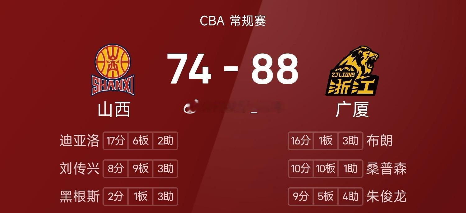 广厦男篮vs山西男篮12月12日 25/26赛季CBA 常规赛,广厦对阵山西。双方全场战罢,广厦88-74战胜山西。布朗得到16分1板3助率队取胜,迪亚洛空砍全场最高的17分6板2助。