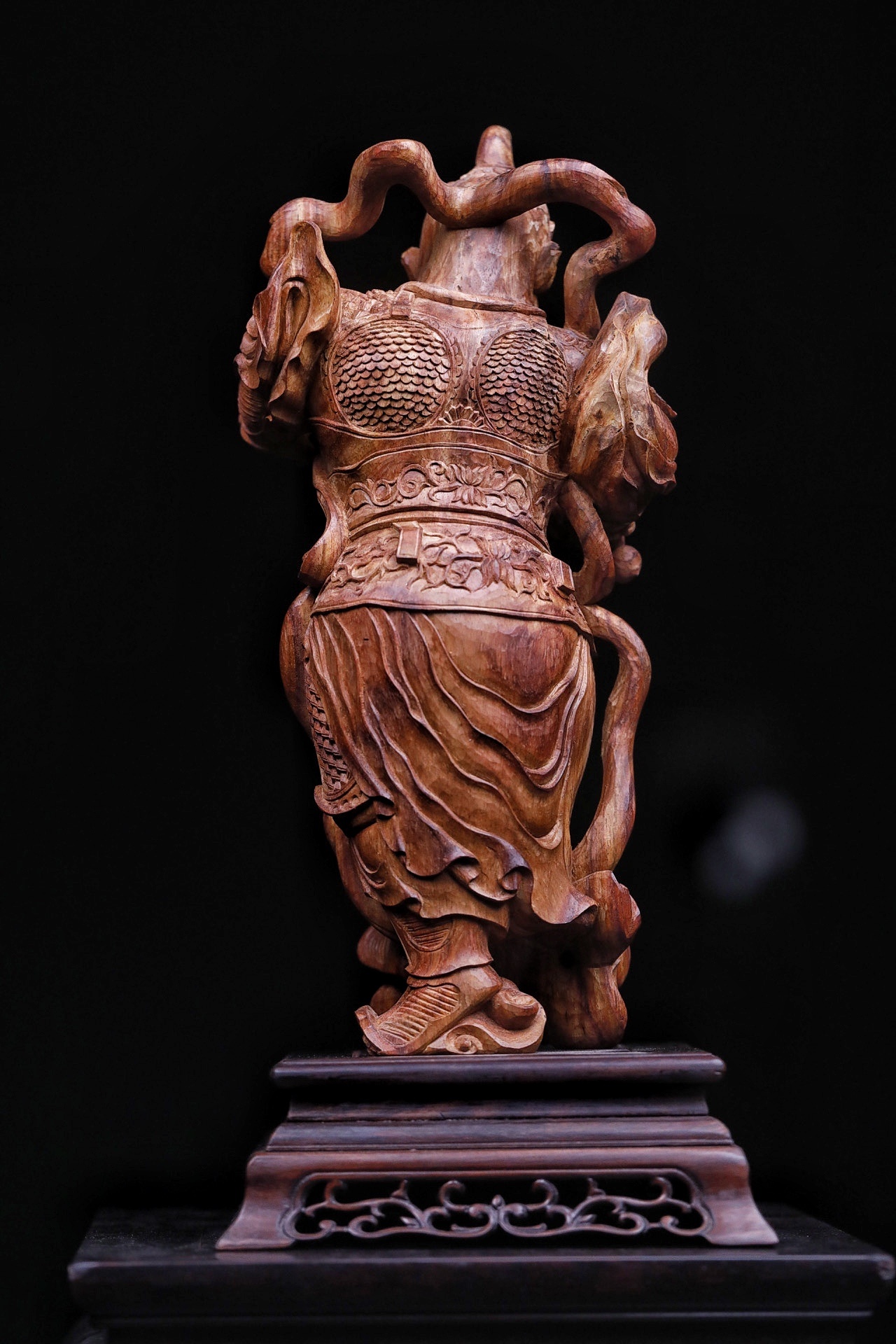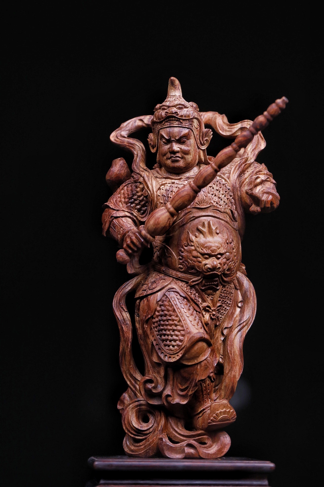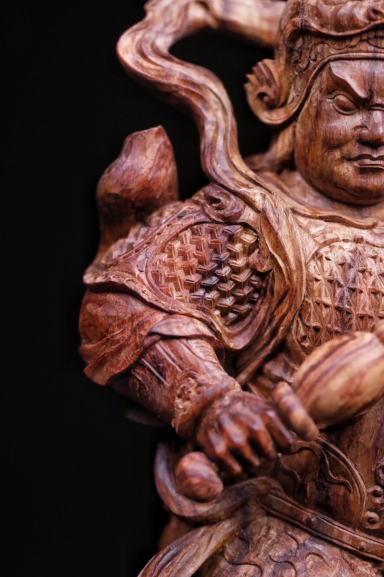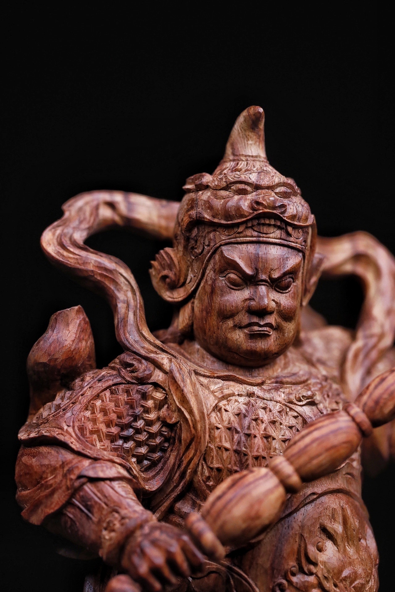 黄花梨|韦陀整料清刀制,韦陀护法像,头戴宝冠,身披铠甲,手持金刚杵,身姿挺拔刚劲。木雕细节处,甲片、飘带雕琢入微,黄花梨的温润质感衬出神将的凛然正气,摆置厅堂,可镇宅辟邪,藏纳平安。不含法器规格:15×11×30cm重量855g底座:16×16×5.5cm