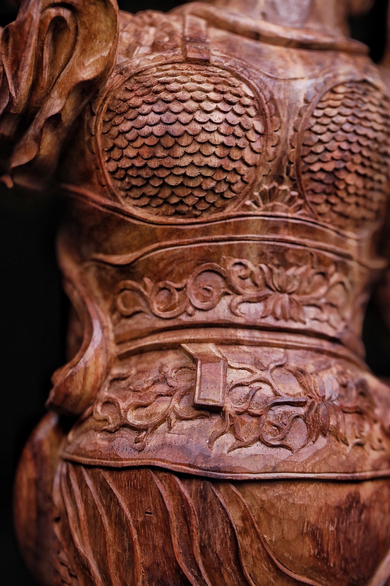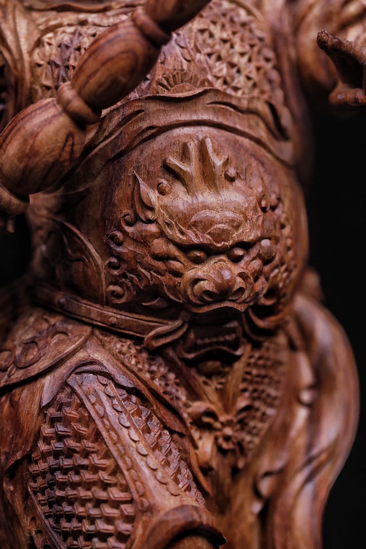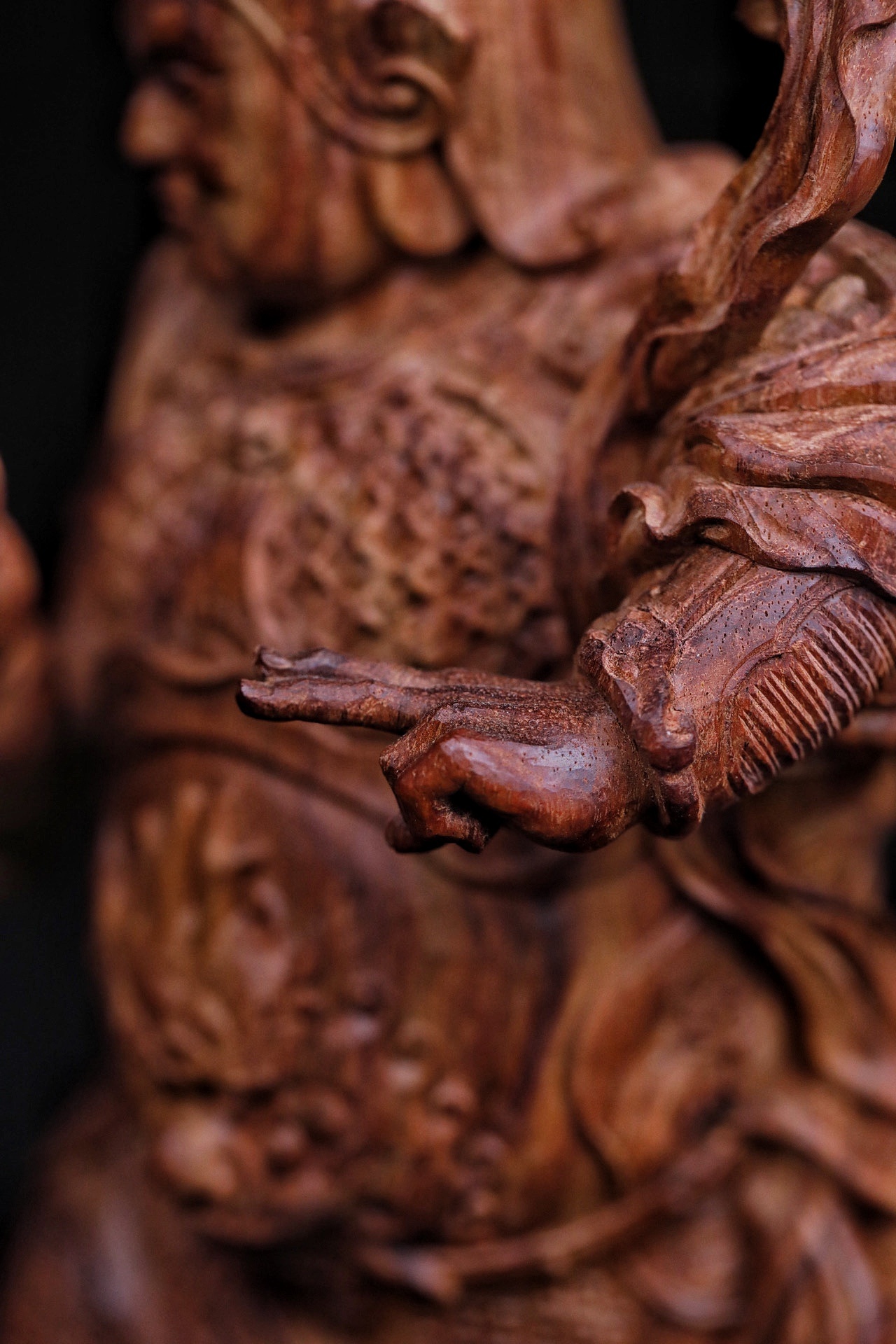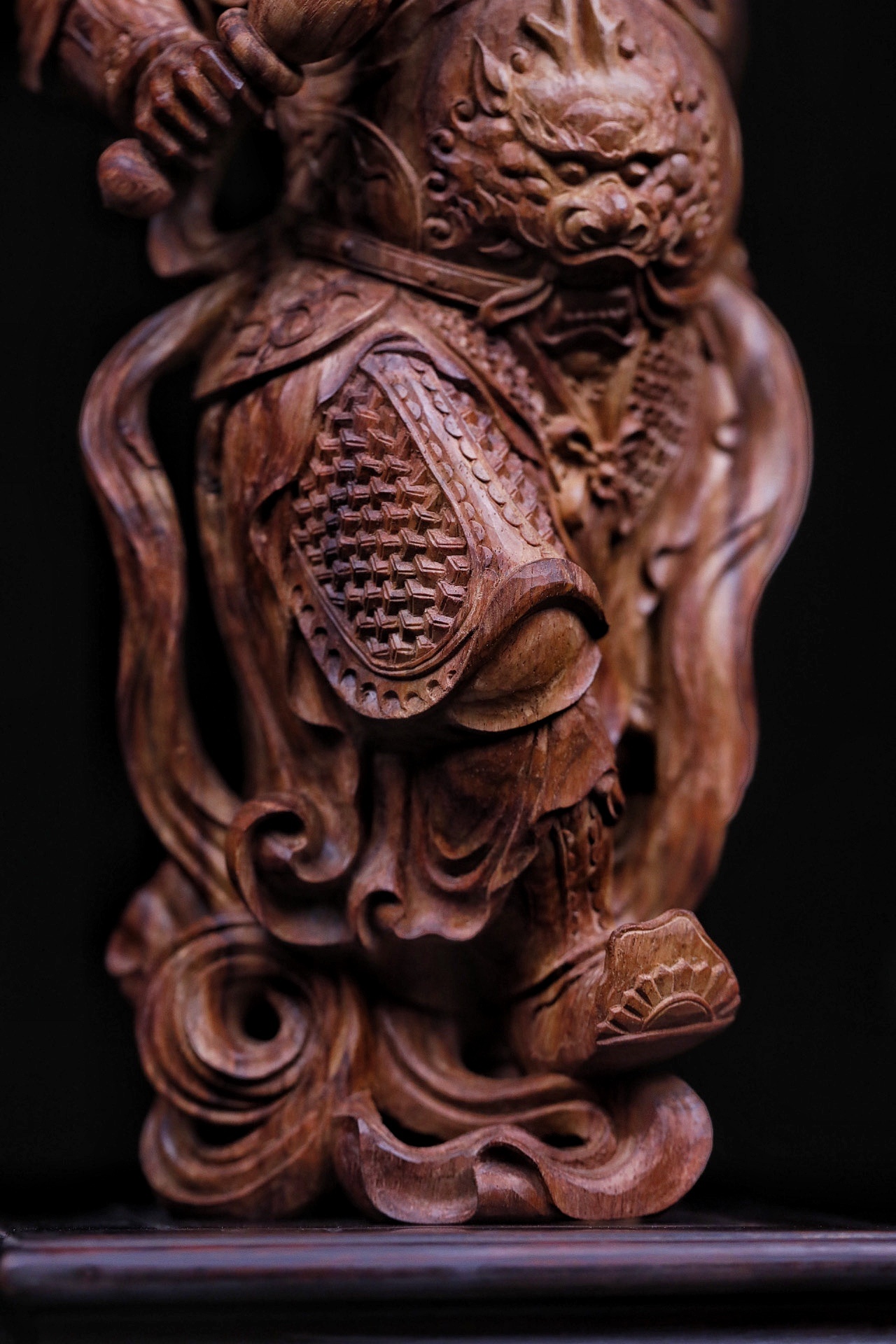 黄花梨|韦陀整料清刀制,韦陀护法像,头戴宝冠,身披铠甲,手持金刚杵,身姿挺拔刚劲。木雕细节处,甲片、飘带雕琢入微,黄花梨的温润质感衬出神将的凛然正气,摆置厅堂,可镇宅辟邪,藏纳平安。不含法器规格:15×11×30cm重量855g底座:16×16×5.5cm