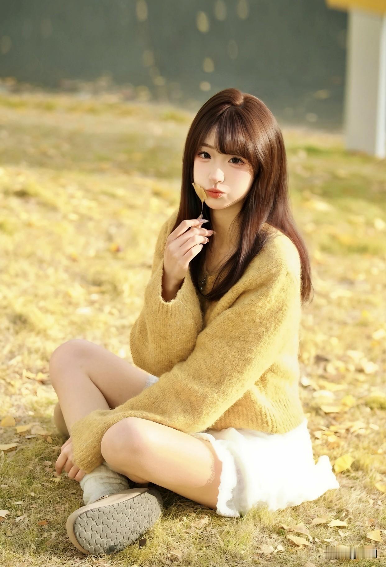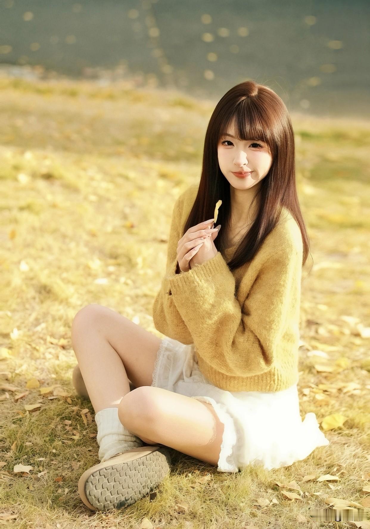 还有淡黄针织短袖配米白百褶裙,也是户外温柔穿搭的典范。淡黄与米白经典清新,针织短