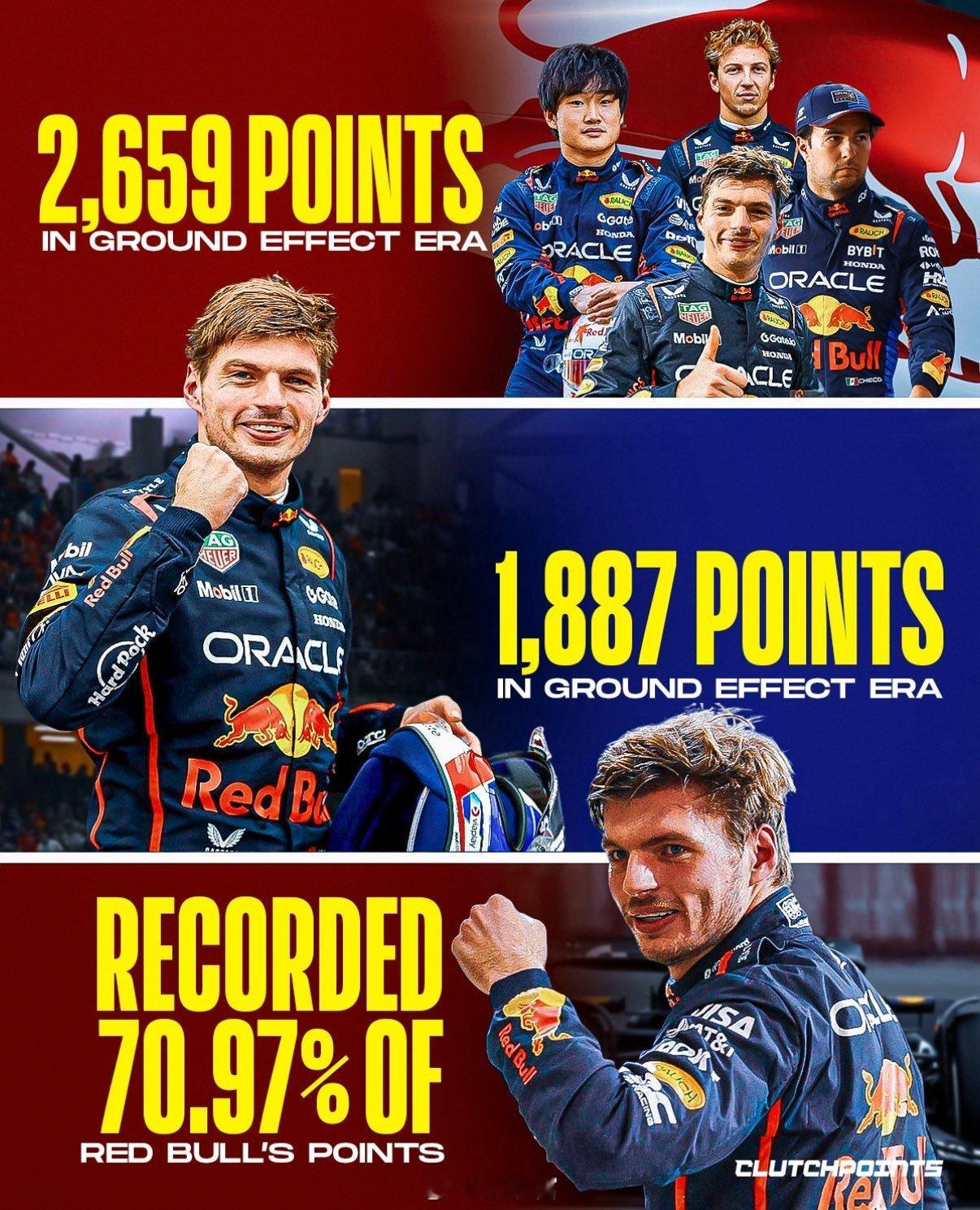 在F1的地面效应年代(ground effect era,2022–25四个赛季),维斯塔潘一人拿到1887分,占红牛车队总积分的超七成,比后六名车队的总积分(Aston Martin: 518,Alpine: 380,Racing Bulls: 198,Williams: 190,Haas: 186和Sauber: 145)还多。