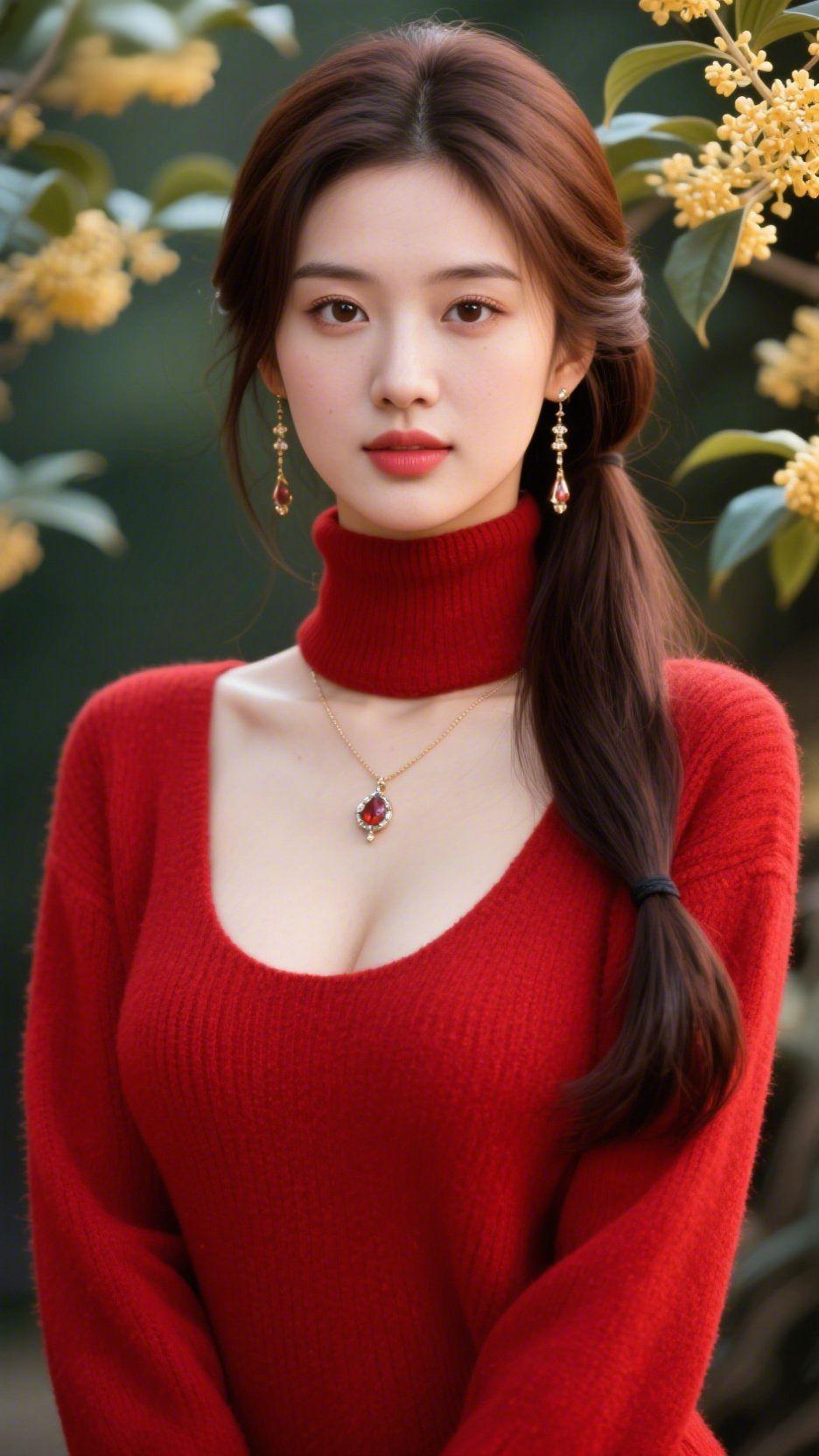 《红衫伴桂秋》 风裹着桂子的甜香漫过枝桠,把秋意抖成细碎的金。她立在花影里,红衫像晕开的落日,裹着晨间的软光——发梢松松束起,耳坠随呼吸轻晃,坠着颗透亮的红,恰与颈间链坠相衬。 桂香是轻笼的纱,绕着她的肩畔。衣料的纹理浸着暖意,把秋的鲜活,收进了舒展的姿态里。不必刻意寻景,她站着的地方,就是秋光偏爱的角落:发丝沾了桂蕊的浅黄,眼底落着云絮的柔,连空气里的香,都慢了节奏。 原来秋的浪漫从不是远观的景,是有人着一身红,撞进桂香里,把寻常的晨,酿成了可藏的温柔。 秋桂与红衣 秋日轻氛围
