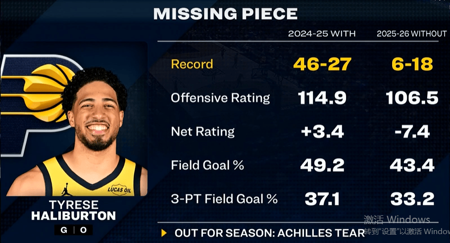 根据NBA官方数据统计:步行者上赛季在泰雷斯-哈利伯顿在场的情况下取得46胜27负,本赛季在哈利伯顿不在场的情况下仅取得6胜18负。