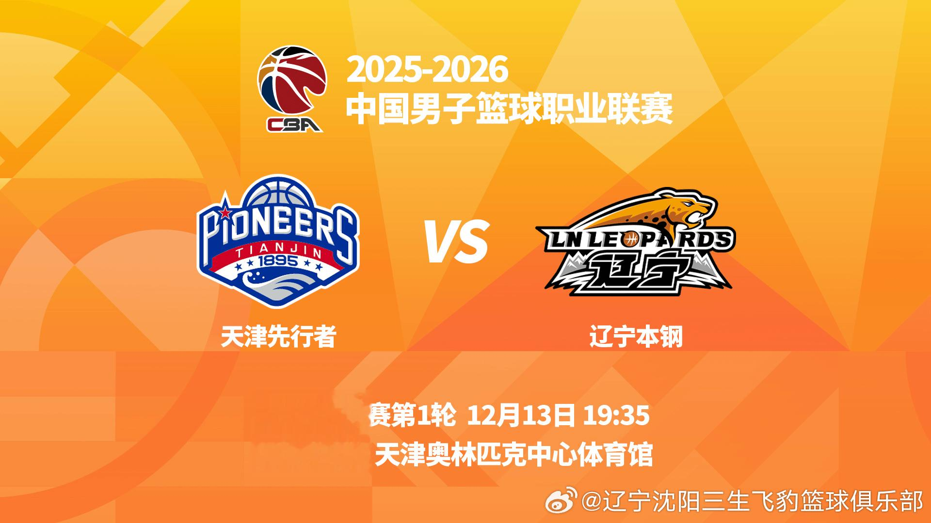 辽宁男篮官方发布赛事预告:12月13日19时35分,2025-2026赛季CBA常规赛第1轮,辽宁本钢将在客场挑战天津先行者。