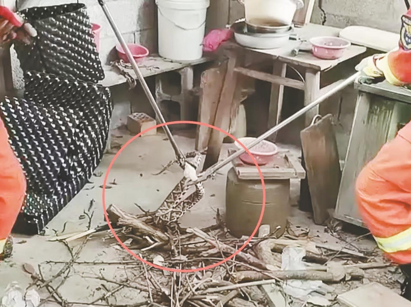 民警刚找到蛇,消防员也赶到了现场。双方默契配合,民警用手电筒照亮位置,两名消防员拿出专业捕蛇工具,精准夹住蛇的七寸位置和蛇尾,另一名消防员在一旁用编织袋装蛇,蛇就被成功“逮捕”了,也算是有惊无险。随后,一行人将蛇带到野外放归自然。见到蛇被抓走,赵女士一家松了一口气,连连致谢。