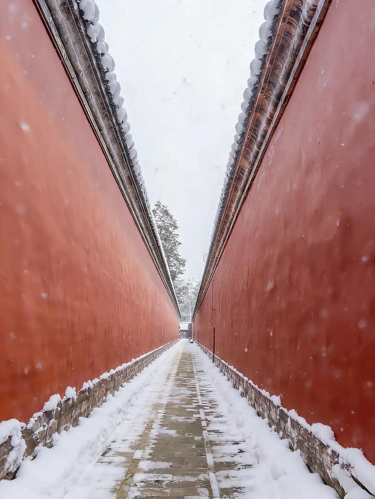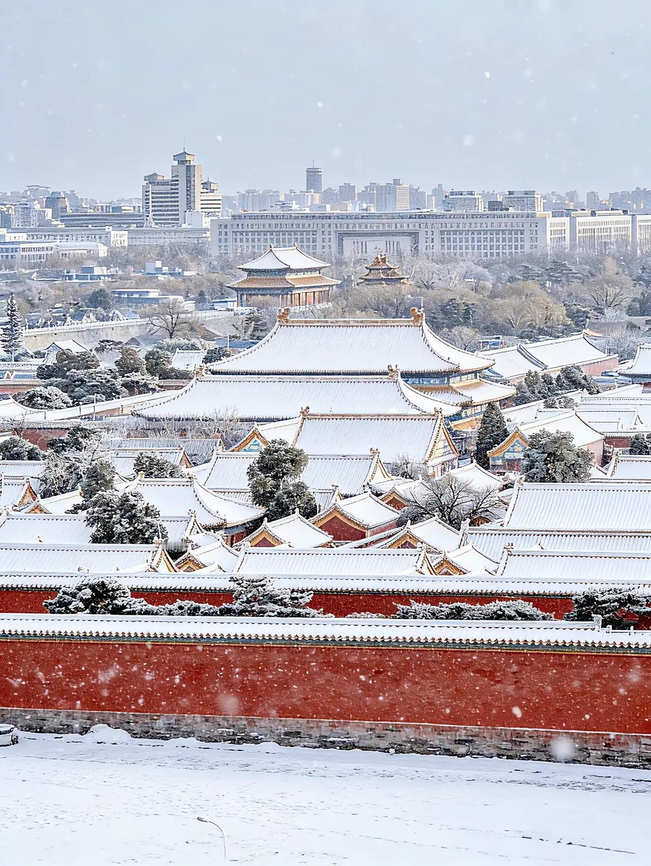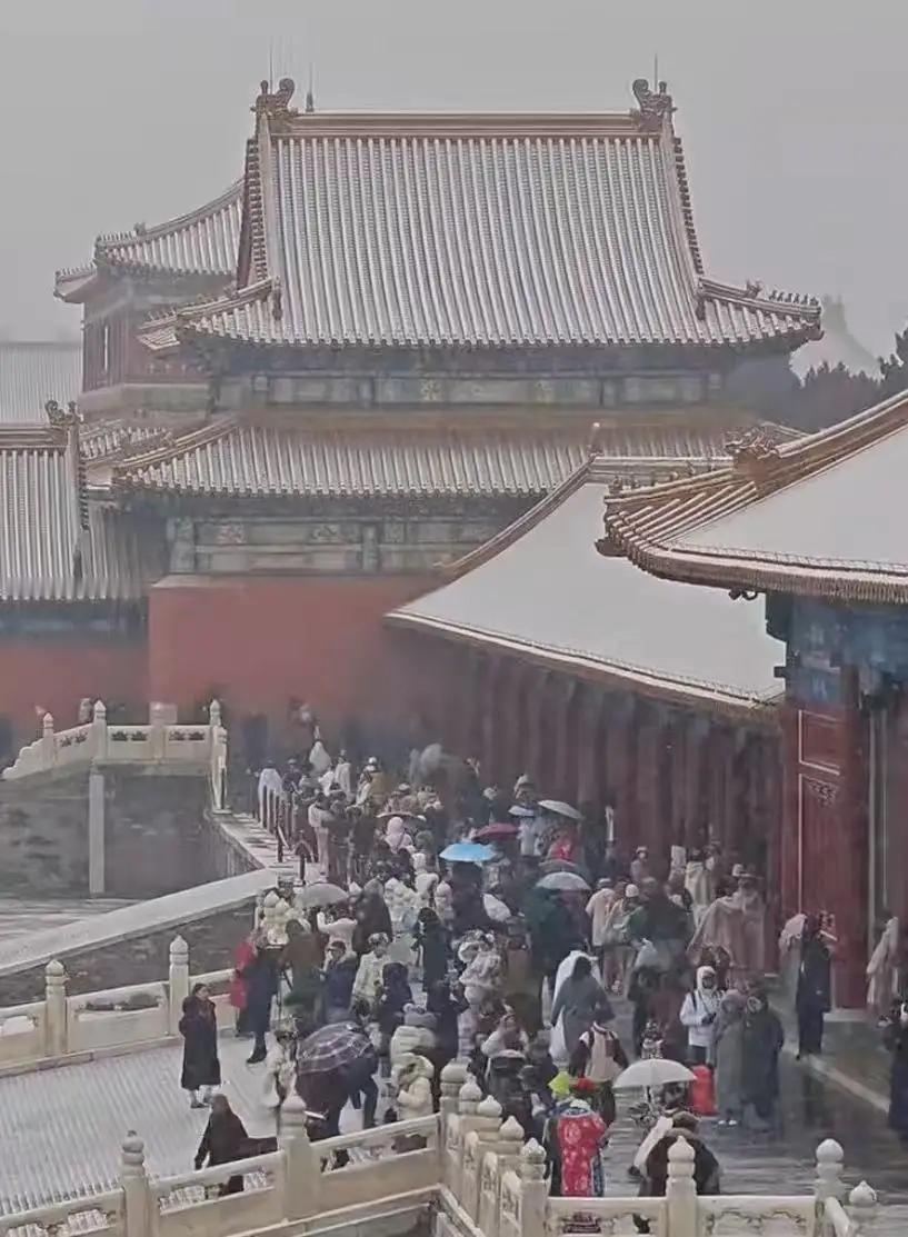 北京的雪如约而至! 那雪成片成片地,悠悠地、沉沉地,从望不见尽头的云层深处飘洒下来。 天地间倏然静了——不是全然的寂静,而是那市声车马声,给一层厚厚的、柔软的绒毯严严实实地捂住了…… 这时候,北京,便在漫天飞絮里,缓缓地、庄重地,变回了北平。 雪中的故宫,处处都像取景框。游客停下脚步,拍照、拍视频。 层层叠叠的雪,映衬出深深浅浅的红……那红墙黄瓦就成了最美的画卷,游人举着相机穿梭在雪中,把红墙白雪的盛景定格! 北京下雪了,你的城市下雪了吗?