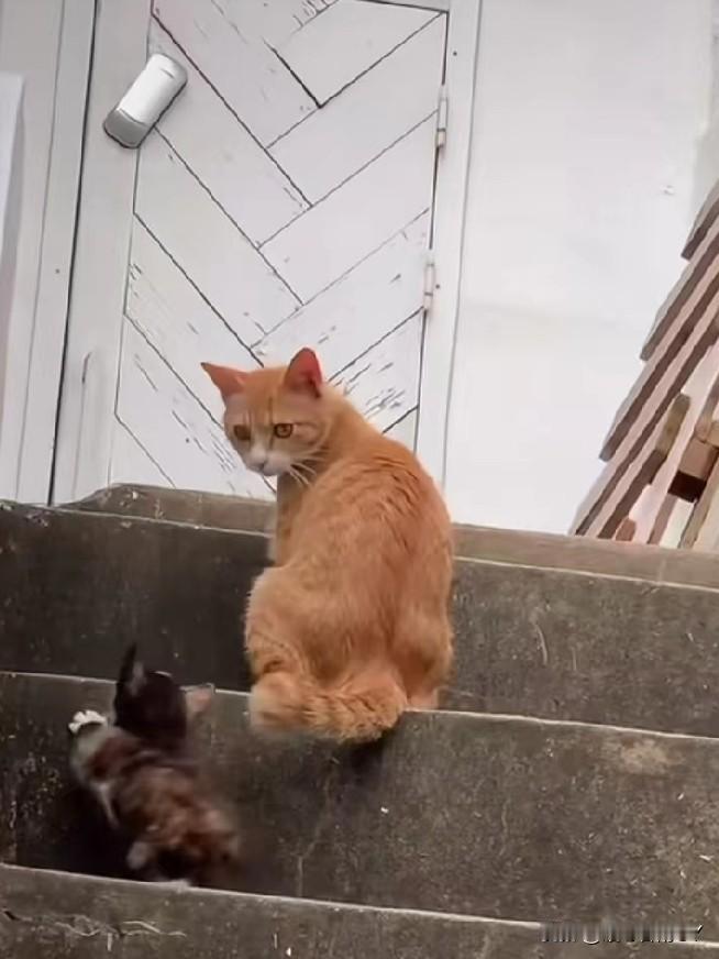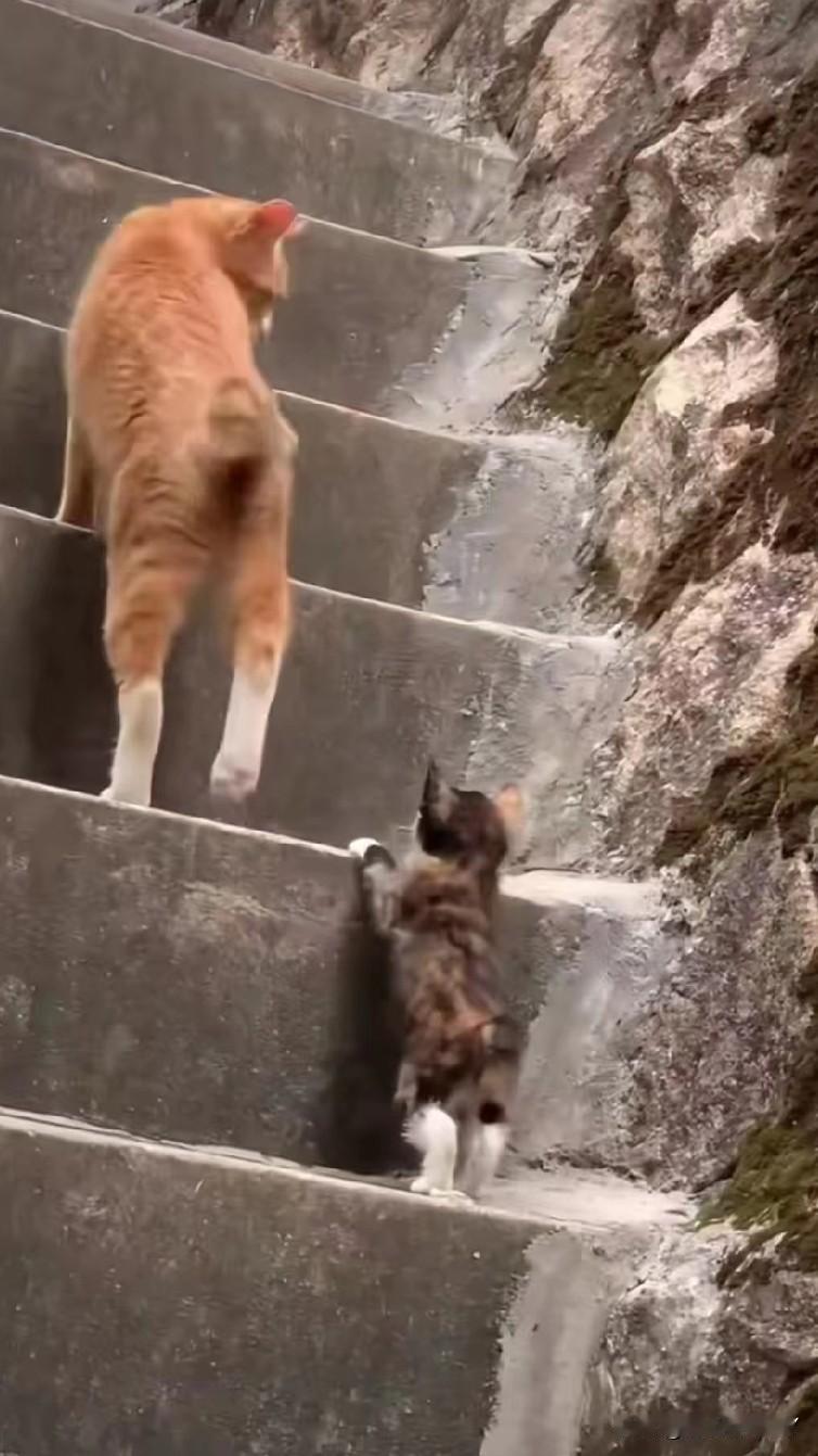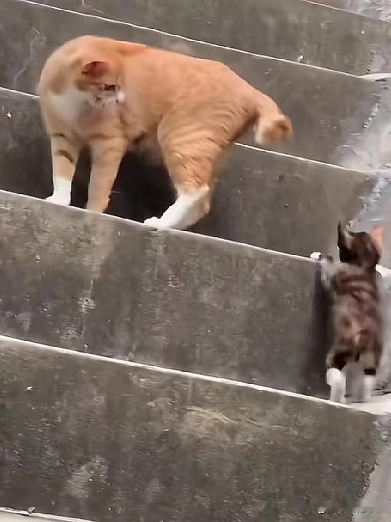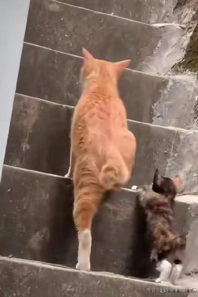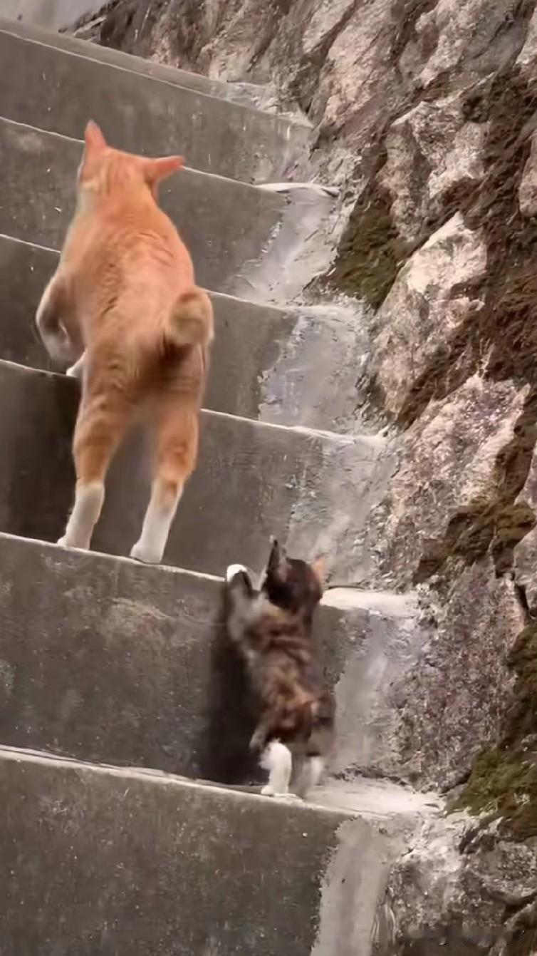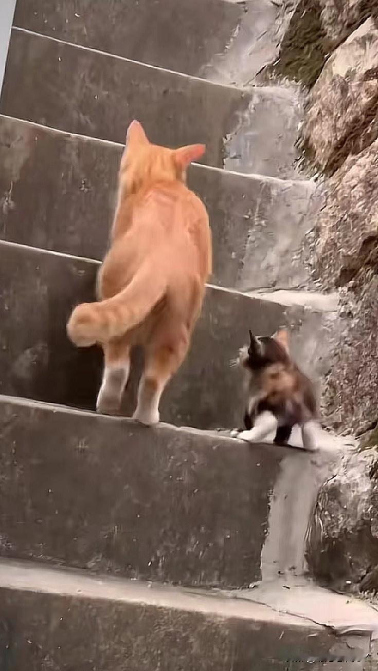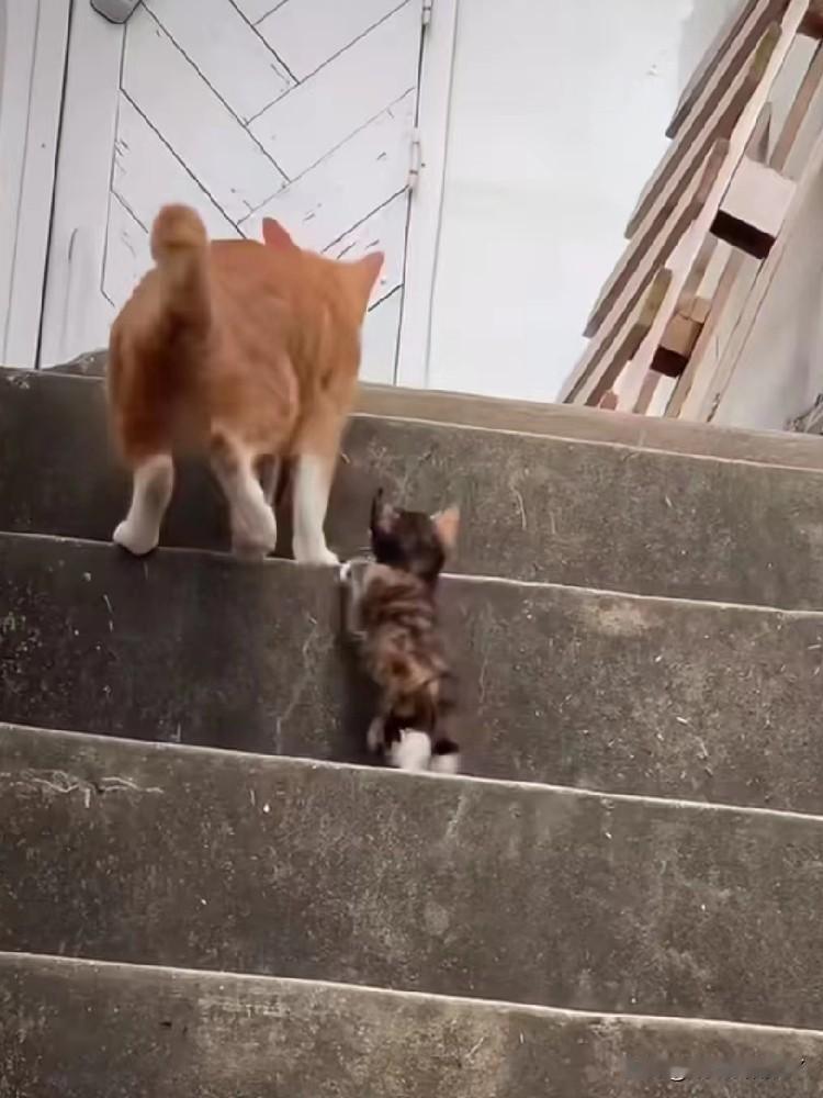 在斑驳的石阶楼梯上,橘猫妈妈领着小奶猫学上台阶,每走一步都频频回头看看孩子,小奶