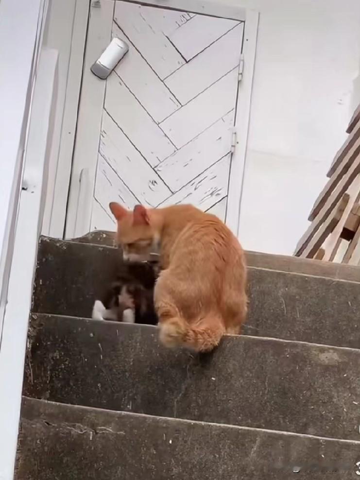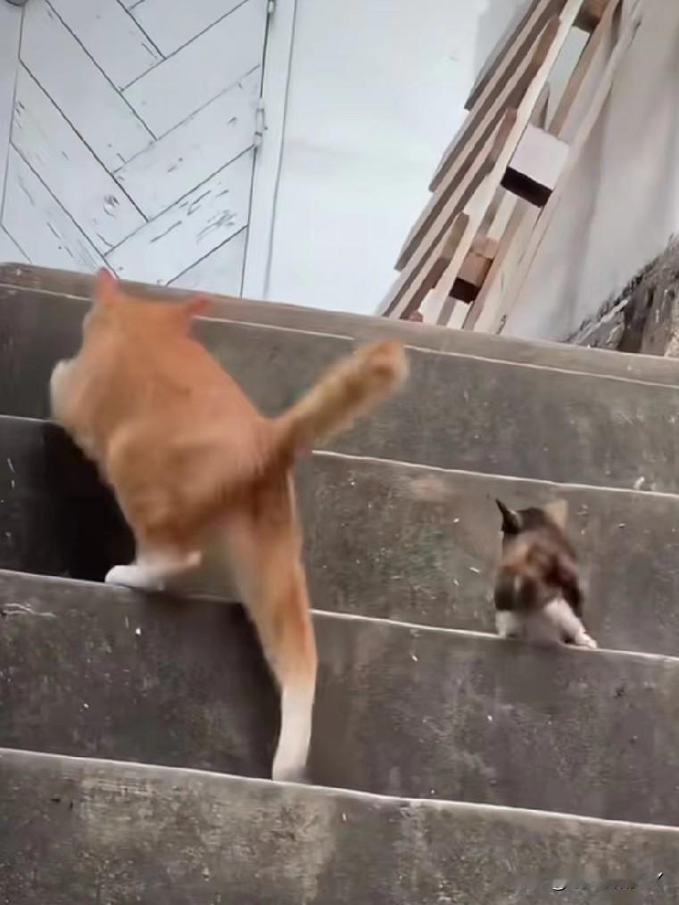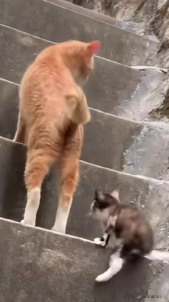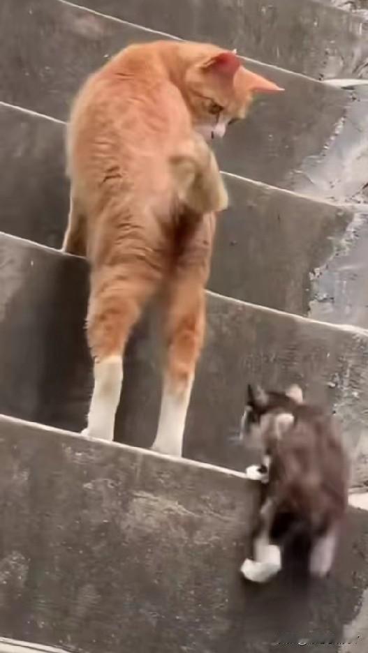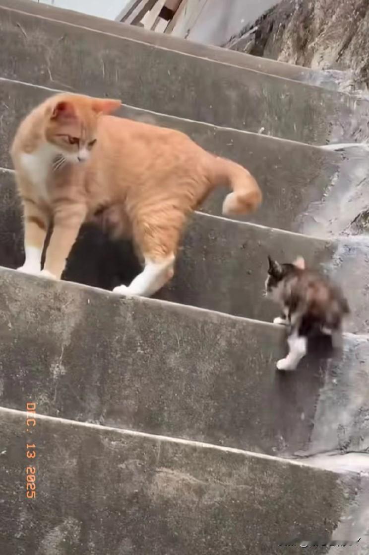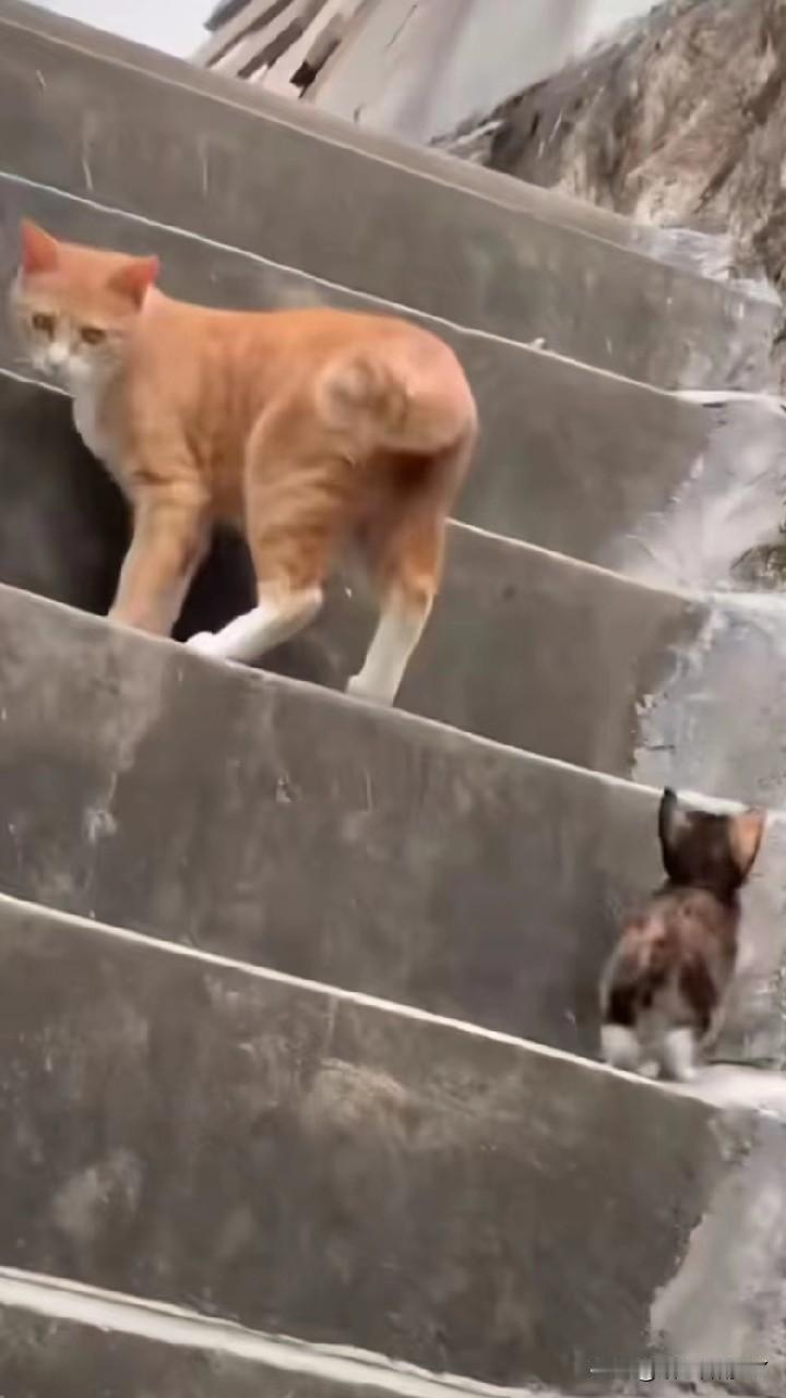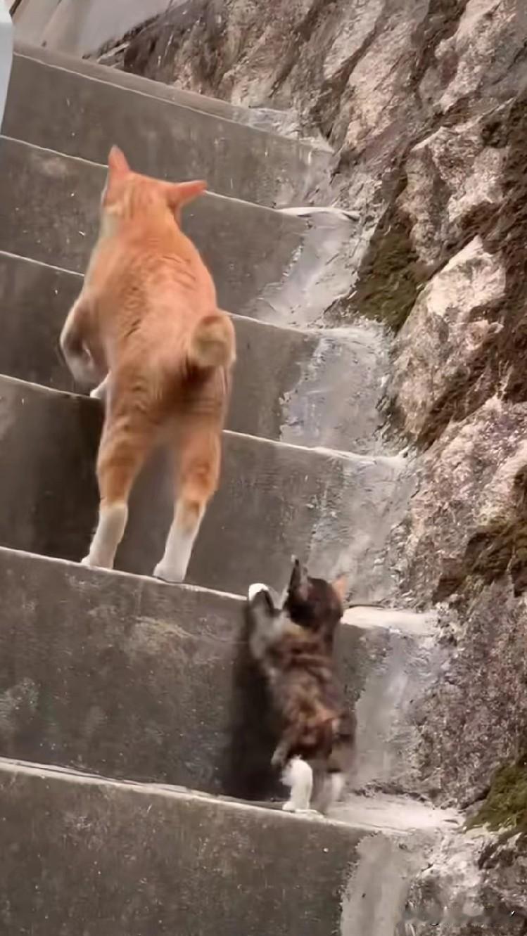 在斑驳的石阶楼梯上,橘猫妈妈领着小奶猫学上台阶,每走一步都频频回头看看孩子,小奶