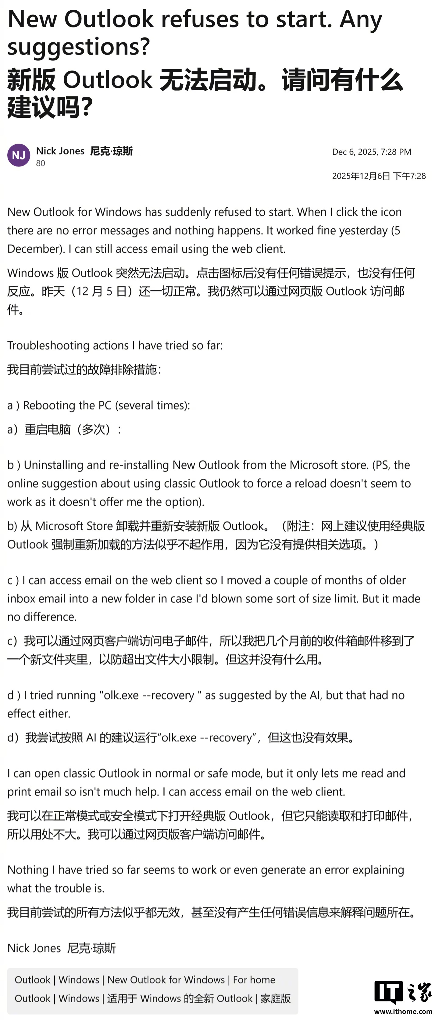 [已持续约1周:多名Win11用户反馈无法打开微软新版Outlook]科技媒体WindowsLatest昨日(12月12日)发布博文,报道称新版Outlook应用在Windows11、Windows10平台上遭遇大范围启动故障,该问题已持续约一周。