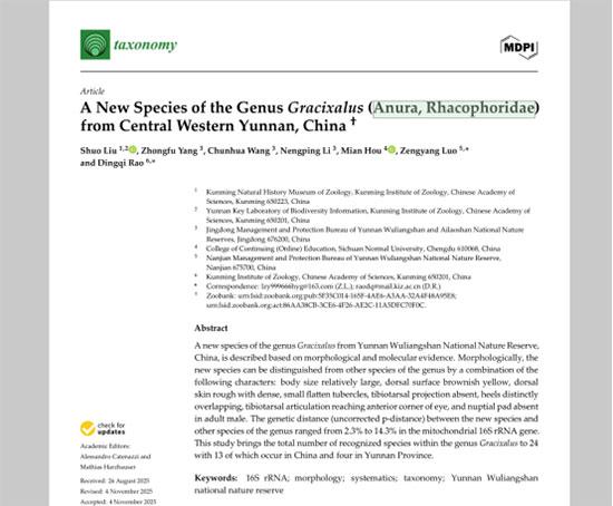 人民网景东12月13日电云南无量山哀牢山国家级自然保护区景东管护局12月12日发布消息,由中国科学院昆明动物研究所联合四川师范大学及云南无量山哀牢山国家级自然保护区景东管护局共同完成的一项纤树蛙研究成果,日前在国际学术出版机构MDPI(MultidisciplinaryDigitalPublishingInstitute)的分类学期刊上发表。该篇论文正式将在云南无量山国家级自然保护区景东片区发现的纤树蛙命名为Gracixaluswuliangshan,中文名:无量山纤树蛙。