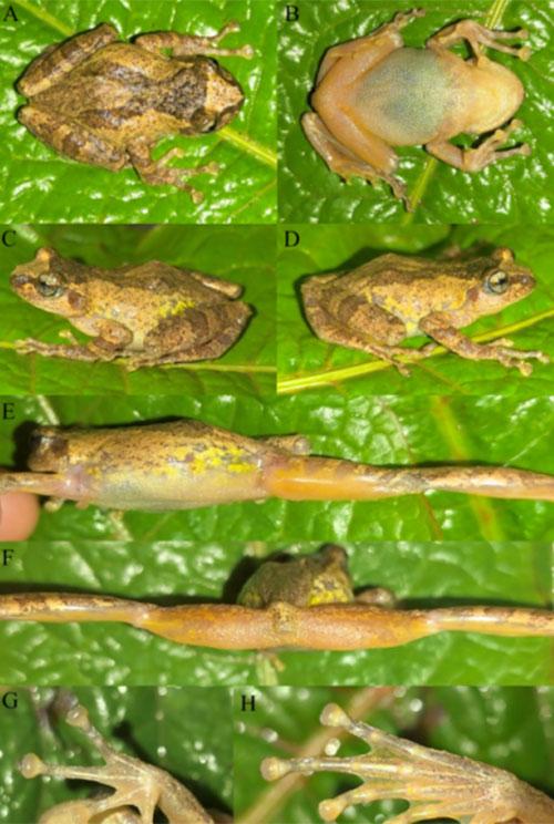 据论文作者中国科学院昆明动物研究所助理研究员刘硕介绍,该新物种相较纤树蛙属其他物种体型较大,体色呈棕黄色,背面皮肤较粗糙具有小二密集的平疣,胫跗关节无凸起的皮褶,左右跟部明显重叠,后肢贴体前伸时胫跗关节达眼前角,雄性无婚垫,有别于其他纤树蛙物种。此外,该新物种与同属其他物种在基因方面也存在着较明显的遗传分化。