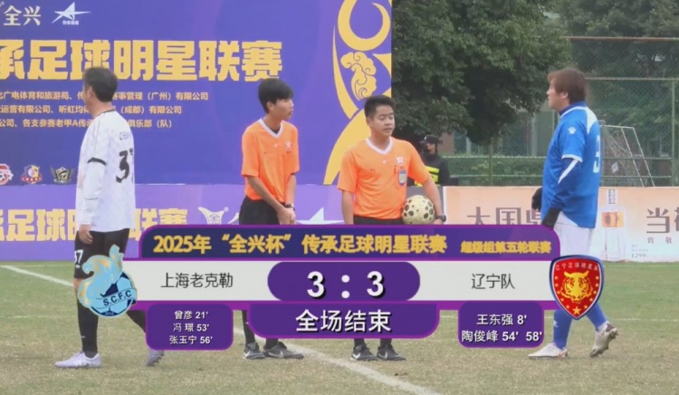 最终全场比赛结束,上海老克勒明星队3-3辽宁足球明星队。