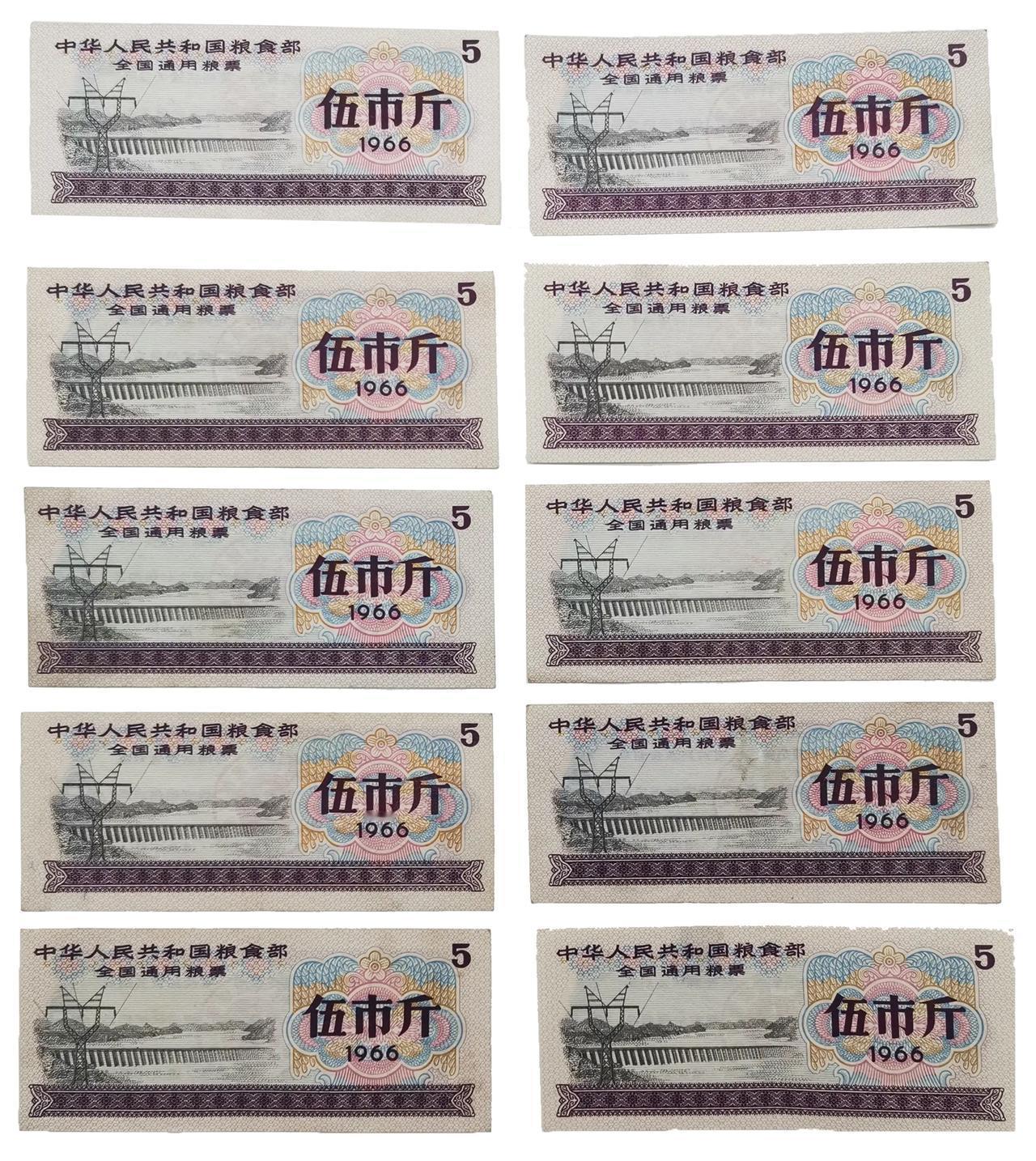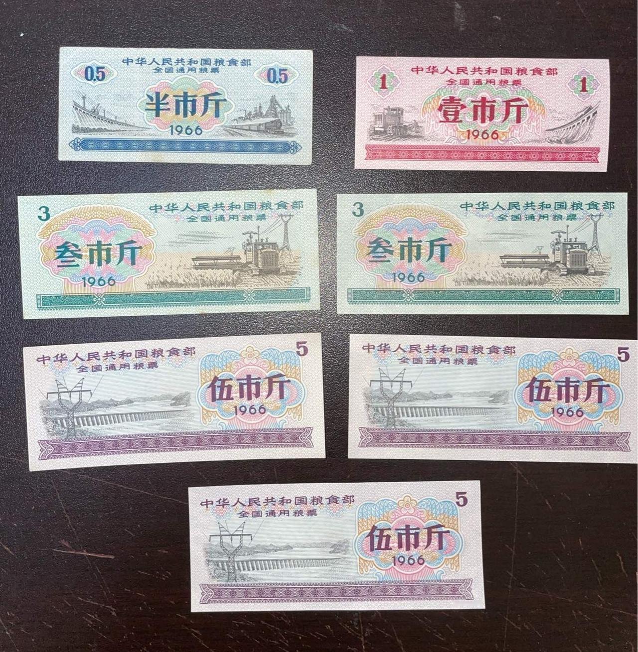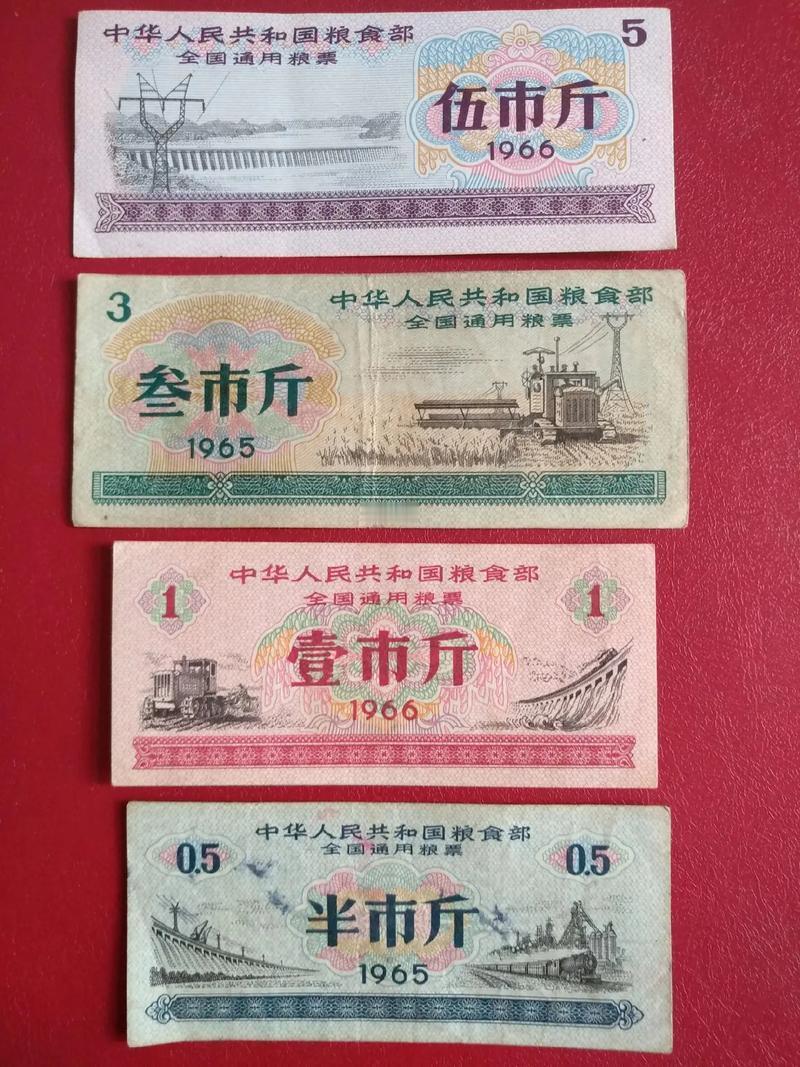 要说1965年的全国粮票,那可是计划经济时期最特别的版本之一。那时候刚度过三年困难时期,国家在1965年首次发行了带水印的全国通用粮票,分半斤、一斤、三斤、五斤四种面额。这套票最神奇的是用了天安门图案的水印纸,对着光能看到清晰的五角星和麦穗暗记,防伪水平在当时算顶配了。 不过这套票实际使用时间特别短,到1966年就换版了,所以全新品相的存世量非常稀少。去年北京荣宝斋拍卖会上,一套四枚全品相的65年粮票拍出了2880元,平均一张票能换台微波炉。而单张的最高纪录要数中国嘉德2023年秋拍,一张带厂铭的五斤面额粮票,因为边纸完整、色彩鲜艳,硬是拍到了1250元。 现在市面上常见的65年粮票,大多是从旧账本里拆出来的,票面常有盖章或折痕。要是能找到带完整边纸的版张,价格能翻好几倍——毕竟这种票最初是整版印刷,流通时都被撕成单张使用。听说有个老会计,退休时把一本未使用的65年粮票册子带回家,去年孙子上网一查,里面五斤面额的整版票竟然值八千多。所以要是家里老衣柜里还压着这种淡黄色的粮票,千万别当废纸扔了,那上面印着的可是一段珍贵的历史记忆呢。老粮票 粮票