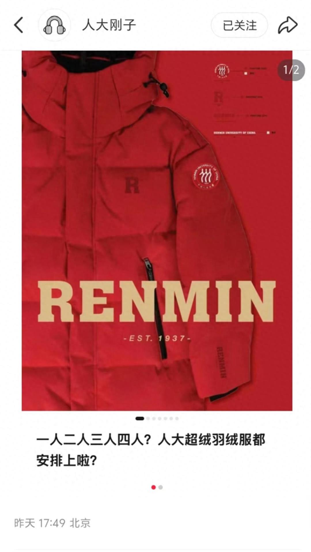从“人大刚子”账号发布的内容来看,这款红色羽绒服有长款、短款、儿童款三种单品,以及“二人世界”“三口之家”“四口之家”的组合套餐。可见这是颇为专业的商业操作,从人群细分到消费场景,逻辑清晰、定位明确,似乎已跳出了“纪念品”的范畴,更接近一条经过认真测算的校园品牌衍生产品线。