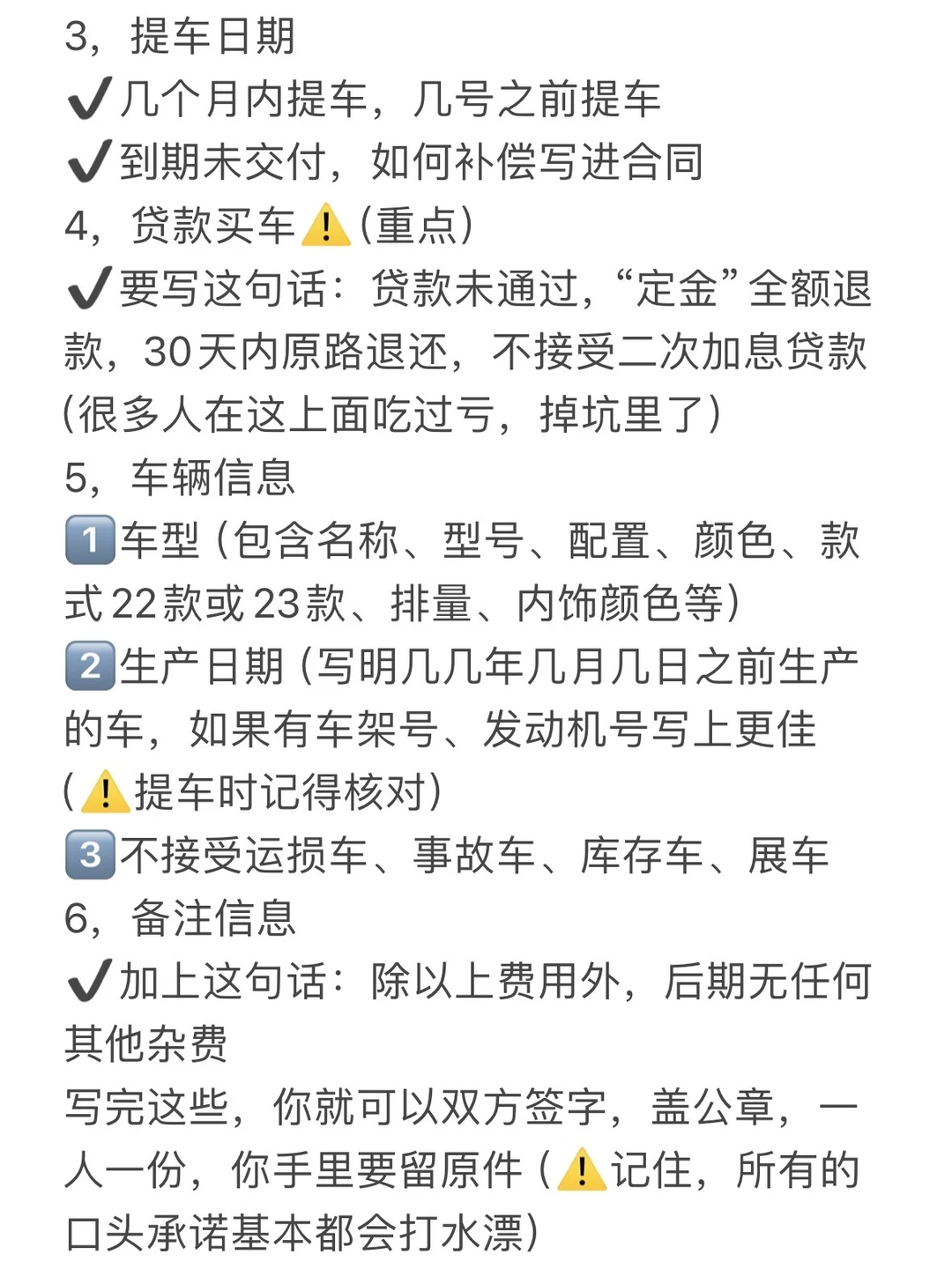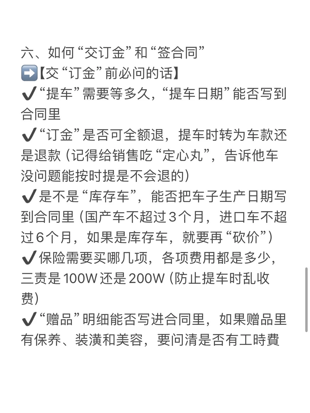 6️⃣问销售:“提车需要多久能否写进合同,到期未交付如何补偿,订金是否全额退,提车时转为车款还是退款”✔️