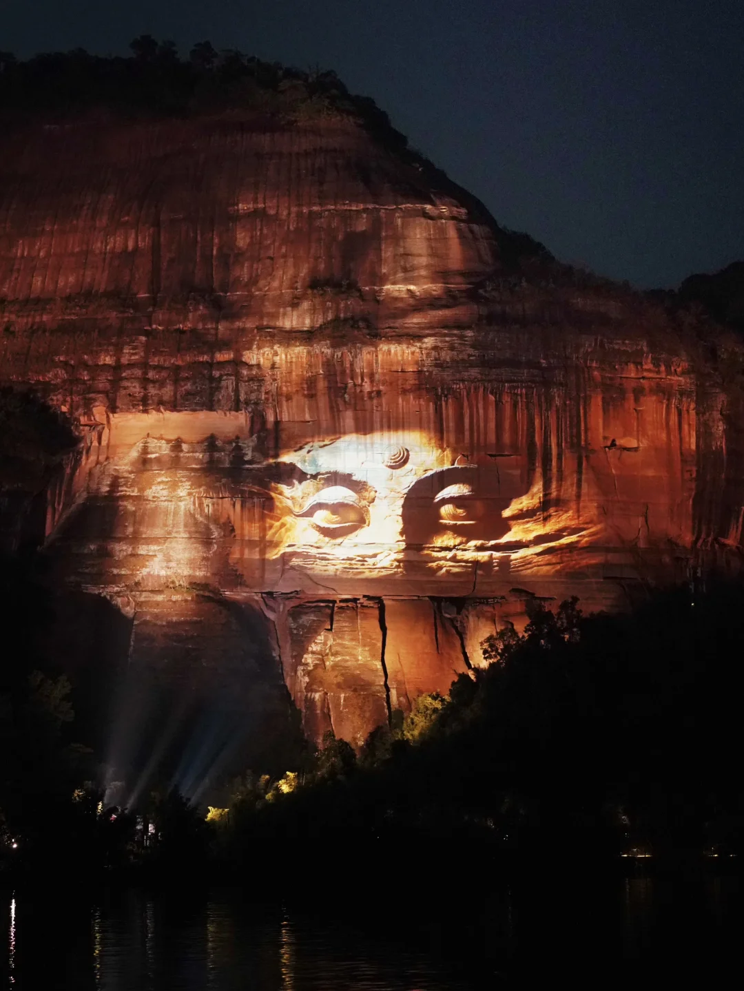 1️⃣夜游丹霞:万古丹霞实景光影秀,坐船上能身临其境的去感受丹霞山的灯光秀,同时还有火壶表演,一共7大场景,28个景观效果。