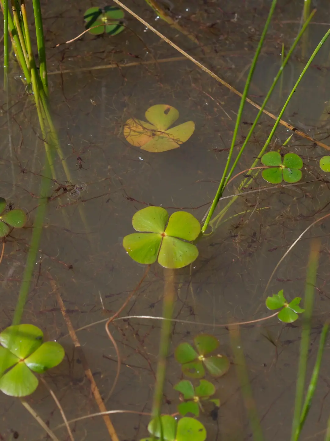 蘋在农田中相当常见,它有匍匐的茎,在泥中横向生长,所以蘋经常成片生长。曾经有一段时间,都市中刮起了一阵追捧「四叶草」的风潮,但正儿八经的「四叶草」也就是白车轴草,却不容易长出四片叶子,于是有一些商家便把主意打到了蘋的身上,制作出了大量的“四叶草琥珀”之类的商品。但蘋可不管人类的时尚风向,它只是继续在湿地中生活,作为湿地生态系统的一部分发挥自己的价值。