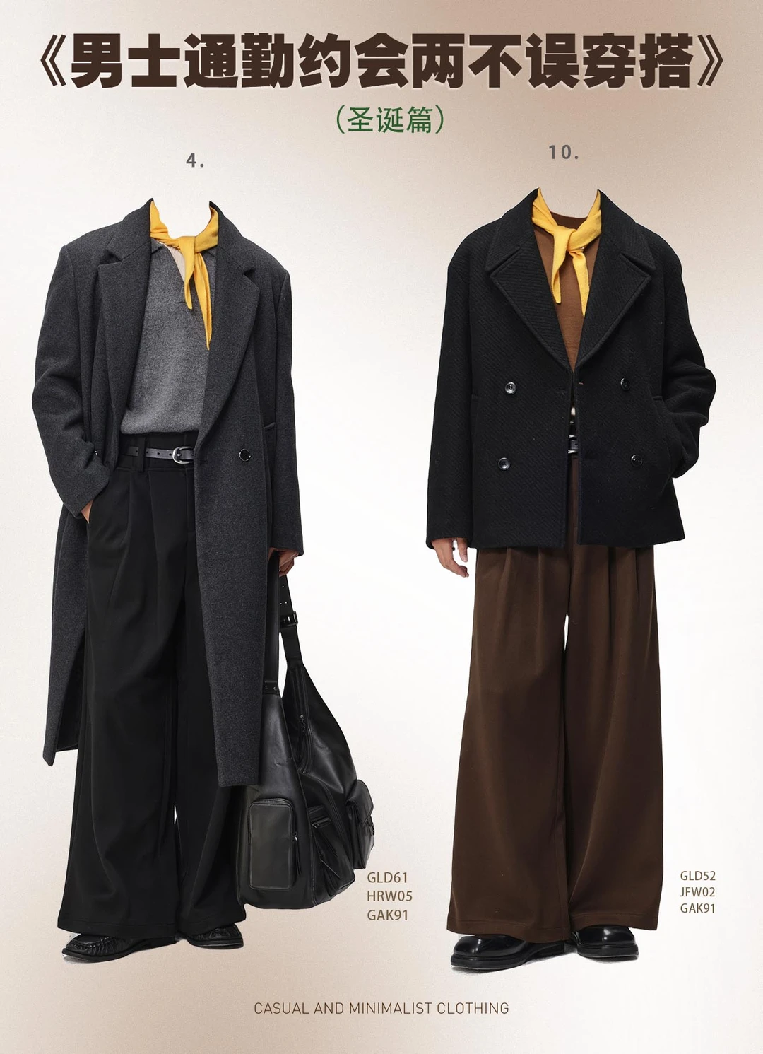 4️⃣黑大衣+焦糖裤+黄丝巾:黑色大衣沉稳干练适配职场,一抹黄色丝巾提亮造型,约会时瞬间打破严肃感,温柔又有个性