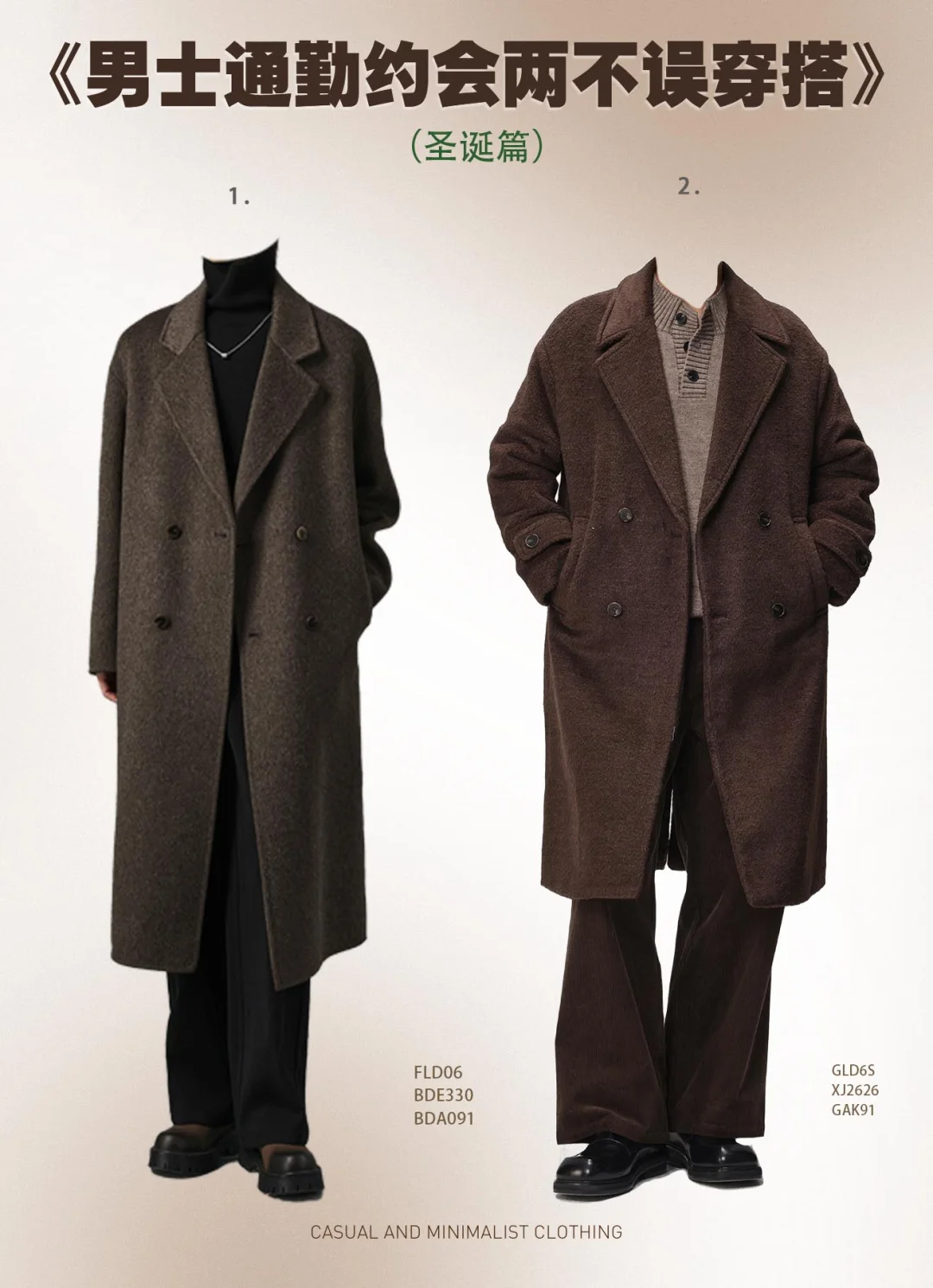 3️⃣深咖长款大衣+黑内搭:极简长款大衣是通勤利器,垂坠感显气场,约会时单穿就很有绅士范儿,细节处藏着品味