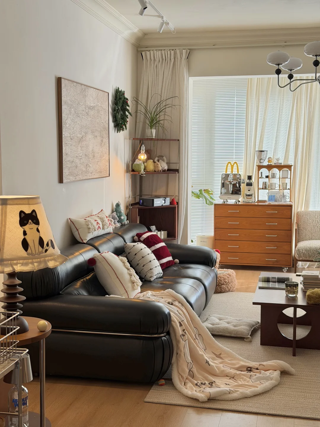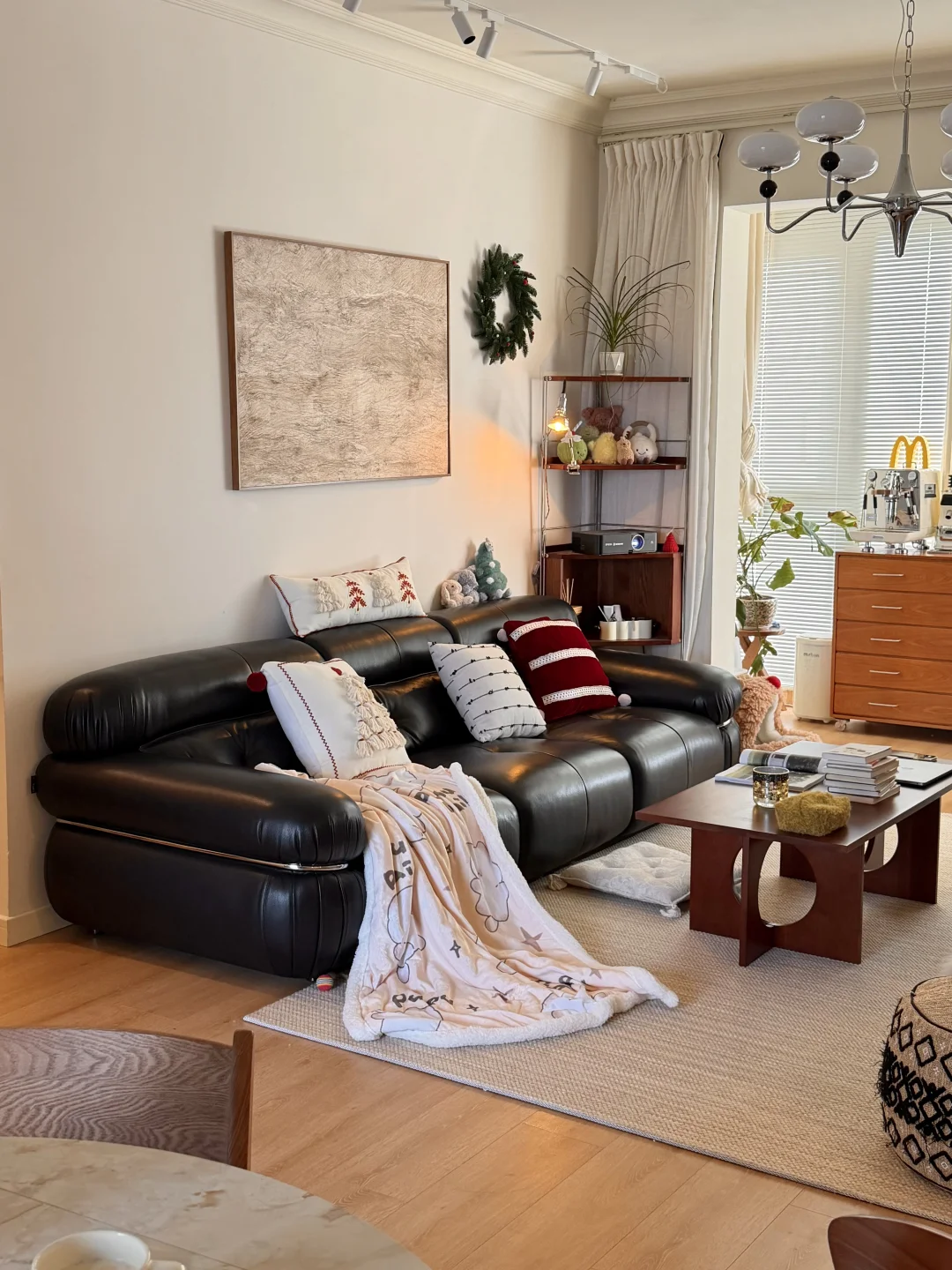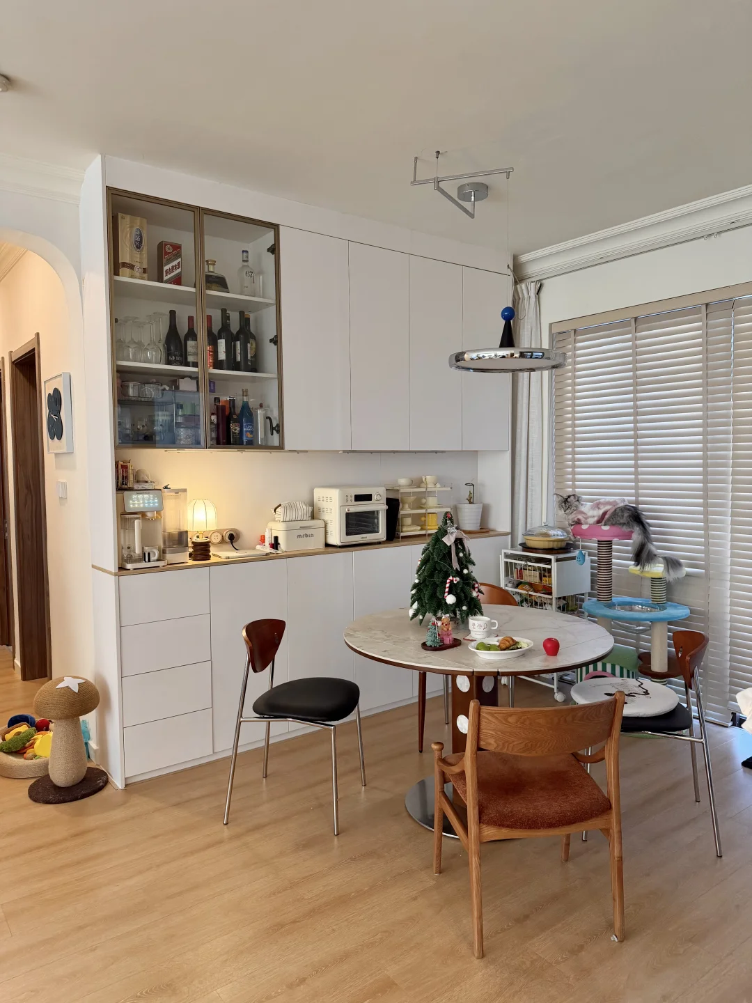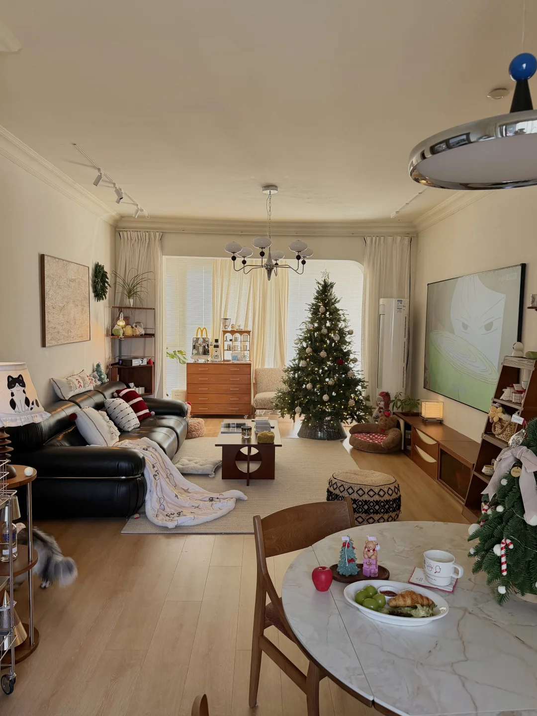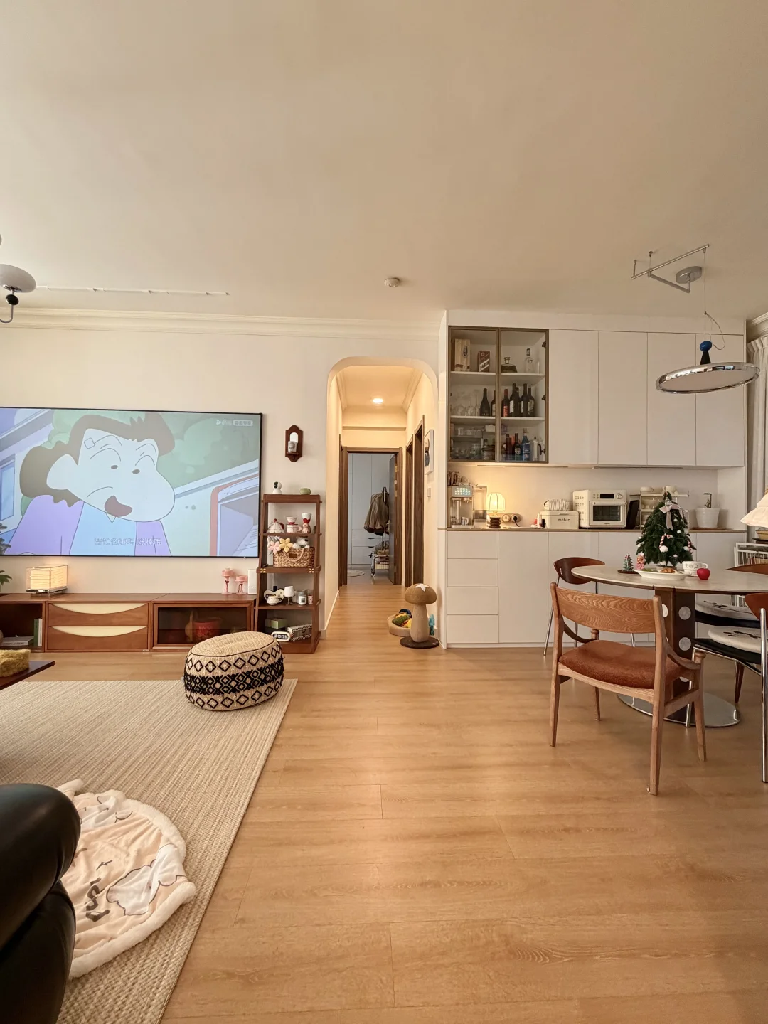 图1是精装交付的时候 图2是现在的家 · 从精装的丑样子,靠软装改造成现在的模样 很欣慰,装修能完全按照自己的喜好来 封阳台➕通铺木地板 风格整体偏中古风 素色地毯搭配黑色沙发 家具大部分都是樱桃木色系的木质柜子 餐厅打的整墙的餐边柜 餐桌也是岩板搭配胡桃木色系桌腿 1.2的直径,放在餐厅刚刚好