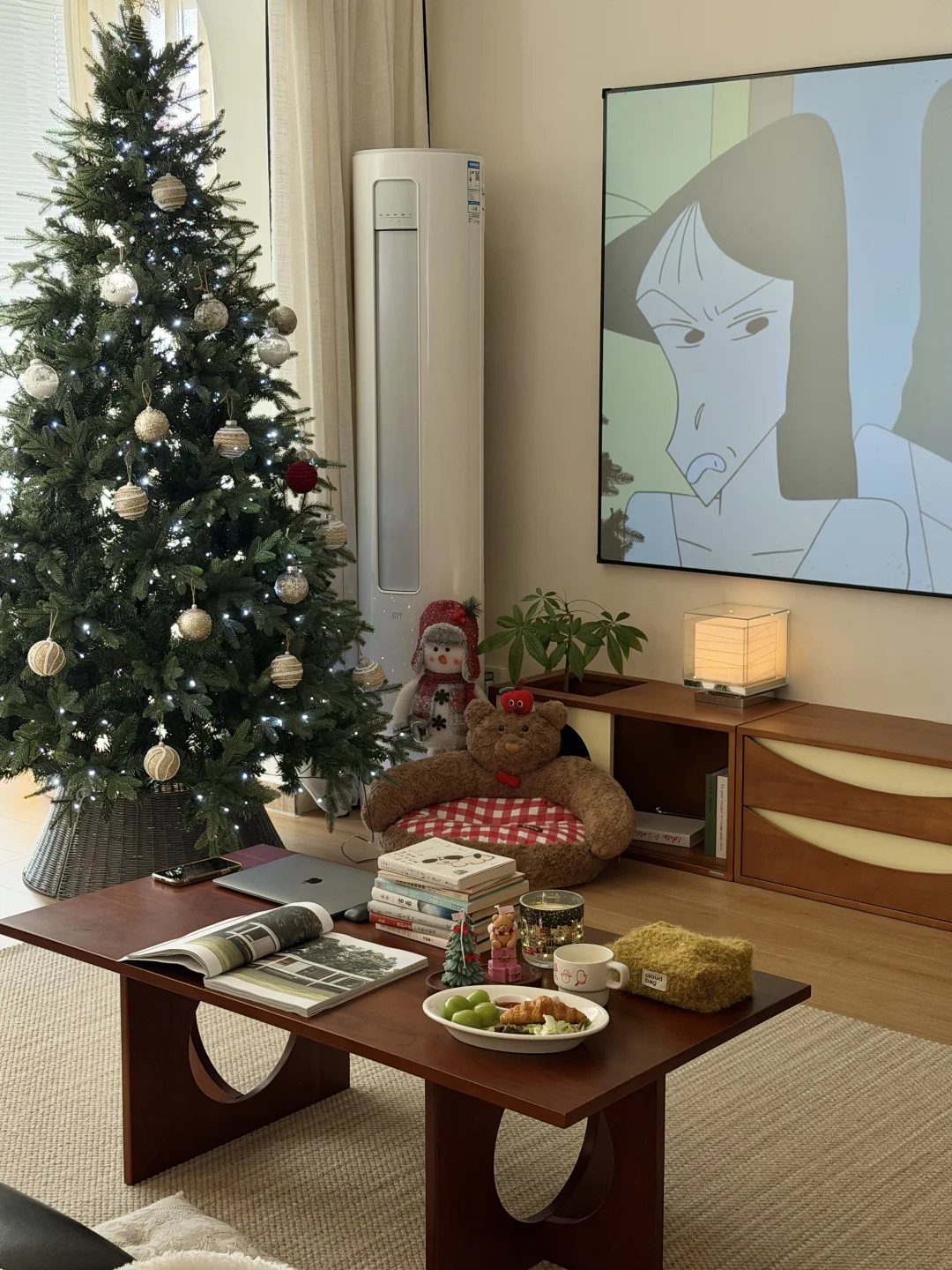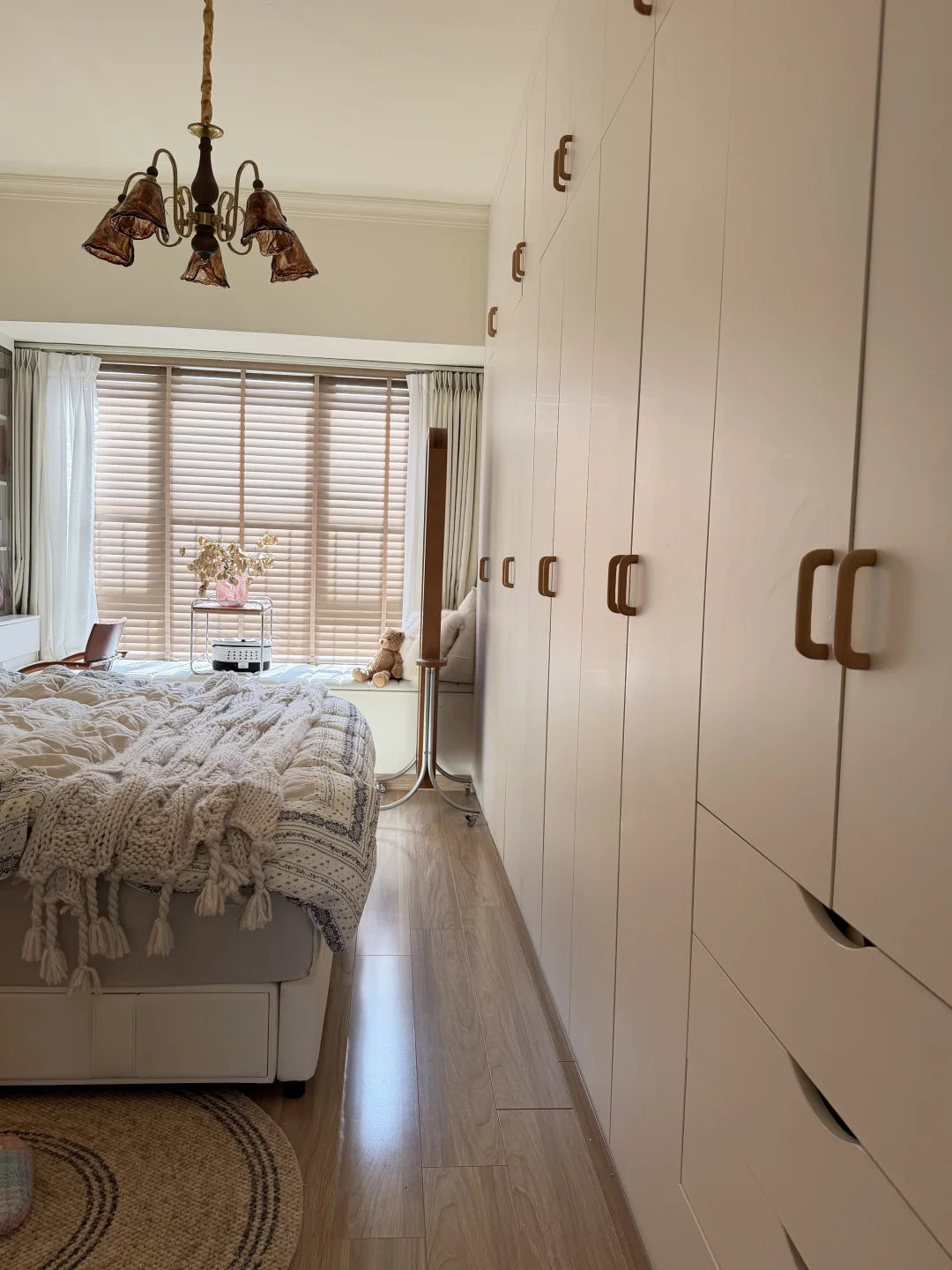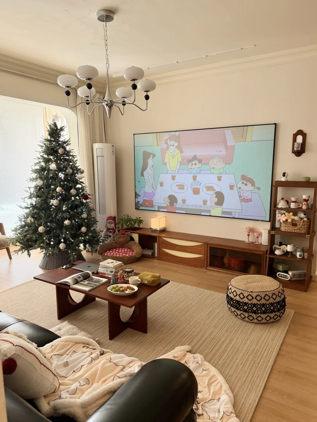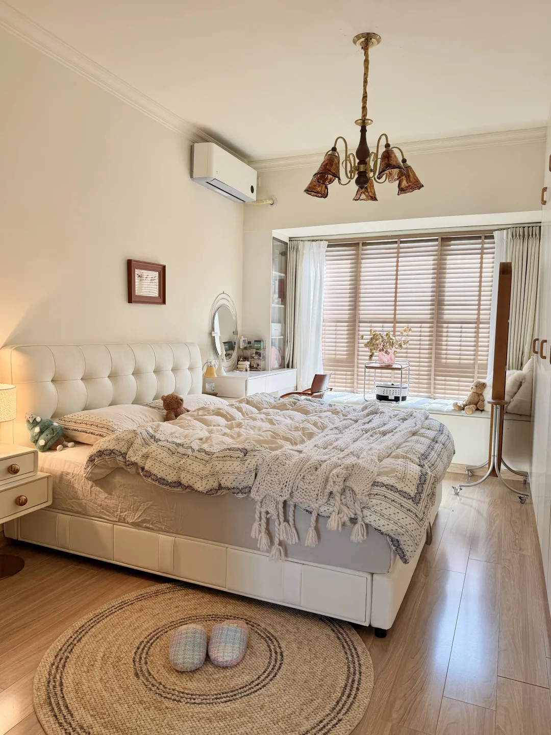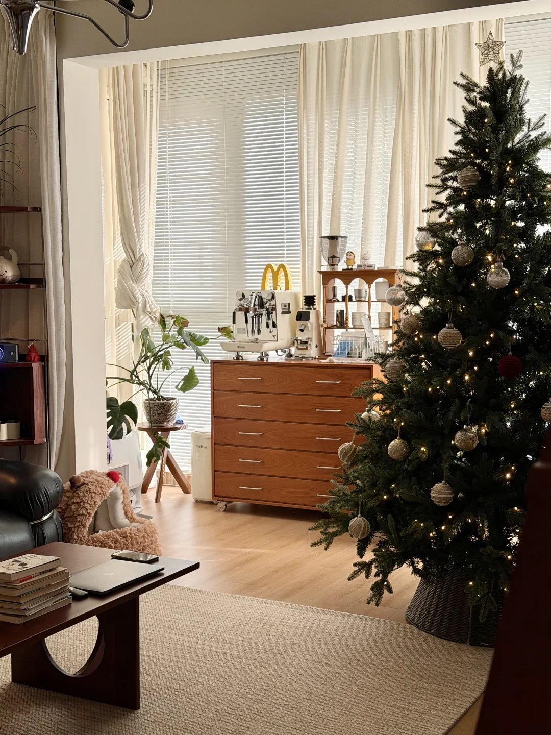 图1是精装交付的时候 图2是现在的家 · 从精装的丑样子,靠软装改造成现在的模样 很欣慰,装修能完全按照自己的喜好来 封阳台➕通铺木地板 风格整体偏中古风 素色地毯搭配黑色沙发 家具大部分都是樱桃木色系的木质柜子 餐厅打的整墙的餐边柜 餐桌也是岩板搭配胡桃木色系桌腿 1.2的直径,放在餐厅刚刚好