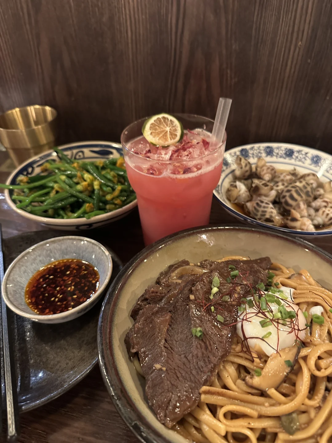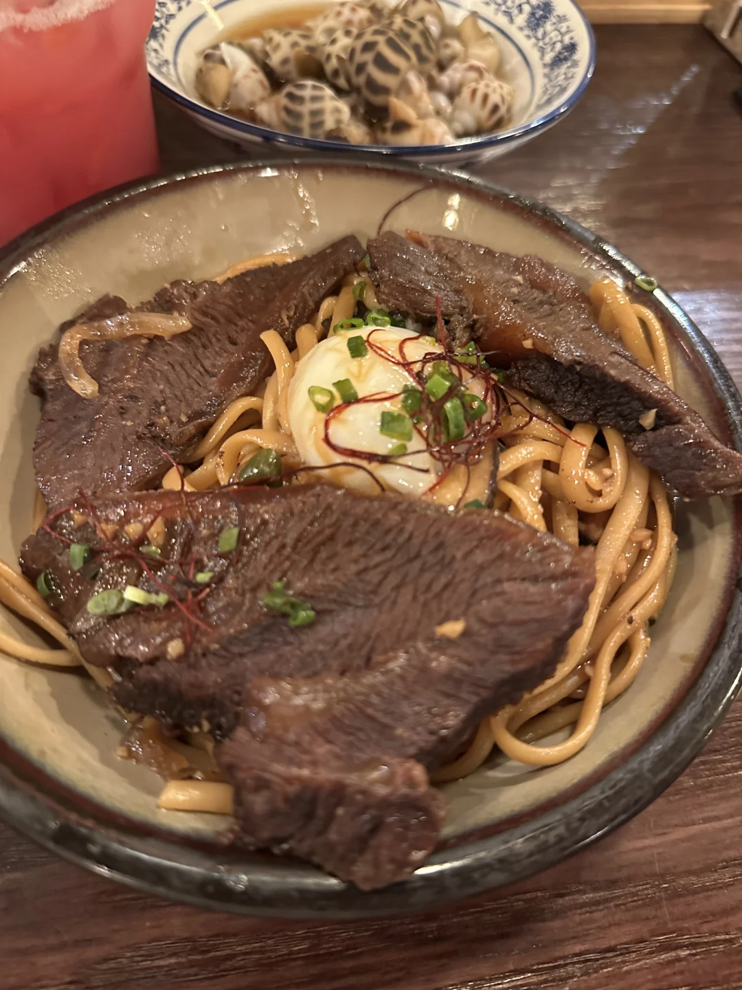 炖煮牛脸肉面直接给我惊到!本以为就一块牛肉,结果用筷子一翻,居然藏着三大块超厚的牛脸肉,这分量也太实在了吧!🥩 牛肉炖得软烂脱骨,轻轻一抿就化在嘴里,裹着浓郁的汤汁,咸香入味;面条吸满了肉汤的鲜味儿,筋道爽滑,一碗下去直接炫饱,幸福感爆棚~