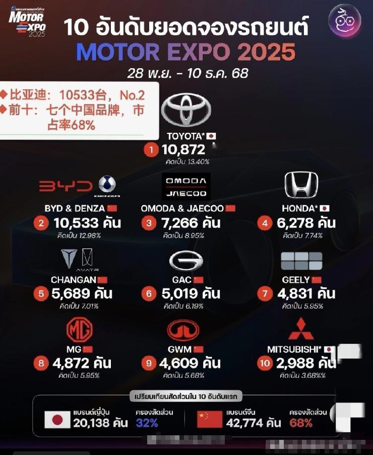这次泰国车展,反映的仍然是丰田汽车的强大。 车展上肯定要下订单的,而丰田汽车还是第一名,得到了10872个订单。 第二名是比亚迪,订单数目为10533辆。 除了这两家企业之外,其他的企业没有一家订单超过1万的。 但这里面最令人振奋的就是,前10个汽车品牌里面,居然有7家是中国品牌,这就非常不容易了。 这说明中国汽车现在在东南亚确实大杀四方,而东南亚人也确实看好了中国新能源汽车的能力,并愿意接受中国新能源汽车。 要知道东南亚一直以来都是日本汽车的自留地,能在这个地方撬动日本汽车的市场,就不得不说说我们当年是到底如何进入东南亚的了。 目前我国总共有7家企业在东南亚各国建有厂子,光是泰国一年就能生产60万辆中国汽车,如比亚迪,长城和广汽埃安之类的,都在泰国有制造工厂。 其他对中国汽车非常友好的还有印尼,这可是个拥有三亿多人口的国家。现在印尼的纯电动汽车市场已经有90%被中国汽车品牌占据。 换一句话说就是在印尼,除了中国汽车外,其他的纯电动汽车都是杂牌。 中国汽车在东南亚主要是分做三步走,第一个是先把汽车卖到东南亚,让东南亚人对中国汽车有所了解。 第二个就是在东南亚各国建汽车生产工厂,雇佣了大量本土工人。 第三个就是打造出本土化的服务以及生态体系,包括充电,售后,电池租赁等全周期的服务。 其实大家转过头来想想就知道,中国车企在东南亚的扩张手段和在国内的扩张手段是完全一样的,只不过是换了一个地方而已。 目前在国内,包括丰田在内的日系汽车已经受到了中国汽车的巨大挑战。而如果同样内容复制到东南亚的话,那么未来日系汽车的困难还会更大。 尽管丰田仍然表现出了强大的韧性,但情况已非常明显,双方之间的差距确实不多了,尤其是比亚迪确实来势汹汹。 泰国的车展也是每年举办一次,不知道若到了明年,会有几家超过丰田汽车订单量的中国车企呢?【来自懂车帝车友圈】