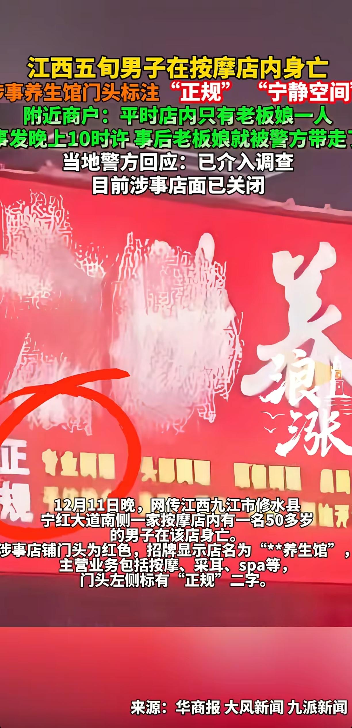 12月12日报道江西九江,一名50多岁男子进入养生馆放松,店内只有老板娘,岂料短短一小时后,男子竟没了呼吸!这家挂着正规按摩,采耳,SPA招牌的红门头养生馆,才刚开业两三个月,平日里,也只有老板娘一人在场,事发后,她被民警带走,店铺也火速锁门,留下满是疑惑的街坊和悲伤的家属。 事情发生在12月11日晚,这名50多岁的男子走进了修水县一家新开的养生馆,想着做个按摩放松一下。谁知道,才过了一个小时左右,意外就发生了,男子没了呼吸。 这家养生馆开业才两三个月,平时就老板娘一个人看店。门头是红色的,还标着“正规”二字,业务范围包括按摩、采耳、SPA这些。 事发后,老板娘被警方带走调查,店铺也关了门。周围街坊都围在店门口议论,有人觉得这家店看着挺正规,出这事儿太意外;也有人说,一个人开店,出了意外都没人照应,确实不安全。 现在警方已经介入,由宁州派出所受理案件。家属急着知道男子的死因,也想弄清楚老板娘到底做了什么。目前案件还在进一步调查中,大家都在等一个明确的交代。 各位读者你们怎么看?欢迎在评论区讨论。 来源:浪涨新闻 2025-12-12报道