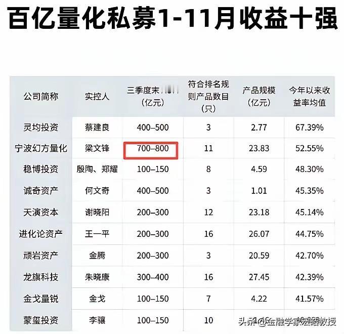 这两天关于整顿量化的声音此起彼伏,周五尾盘股临近尾盘大跌就跟市场传闻交易所要求清理券商客户的专属交易设备,这个客户指的是谁?就是量化机构,他们用离交易所最近的设备来获取速度优势,此次调整就是要让高频交易降温,让市场更加公平。 今年以来有6家量化私募以绝对优势占据百亿私募1-11月排行榜前十,灵均投资更是以67.39%的收益位列第一,但是资金规模最大的还是梁文锋的宁波幻方量化,有700-800亿,毕竟梁文锋的国运级别产品Deepseek帮助他影响力大增,资金规模比去年多了二百多亿,业绩也从去年第19上升到第2,收益能达到52.55%。此次,监管出手,不是要取消量化,而是要让量化减少交易频次,把每秒300笔的速度降一降,营造跟广大散户一样公平的交易环境。