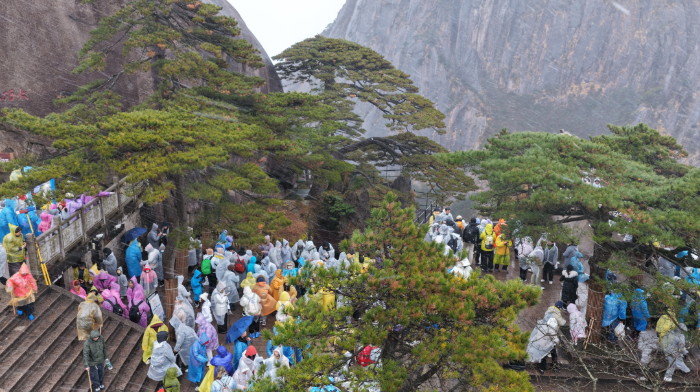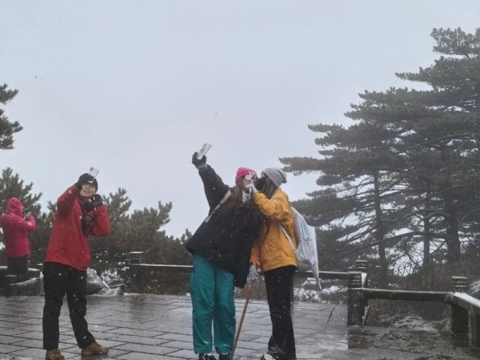 首场降雪如一场精心策划的冬日盛宴,为游客的登山之旅带来无限惊喜。在迎客松、梦笔生花、光明顶等地,大家放慢脚步、驻足赏景,或仰头承接飘落的雪花,或俯身细观松针上的冰晶,或和身边亲友开心合影,惊叹声与快门声此起彼伏,交织成冬日里动人的交响曲。