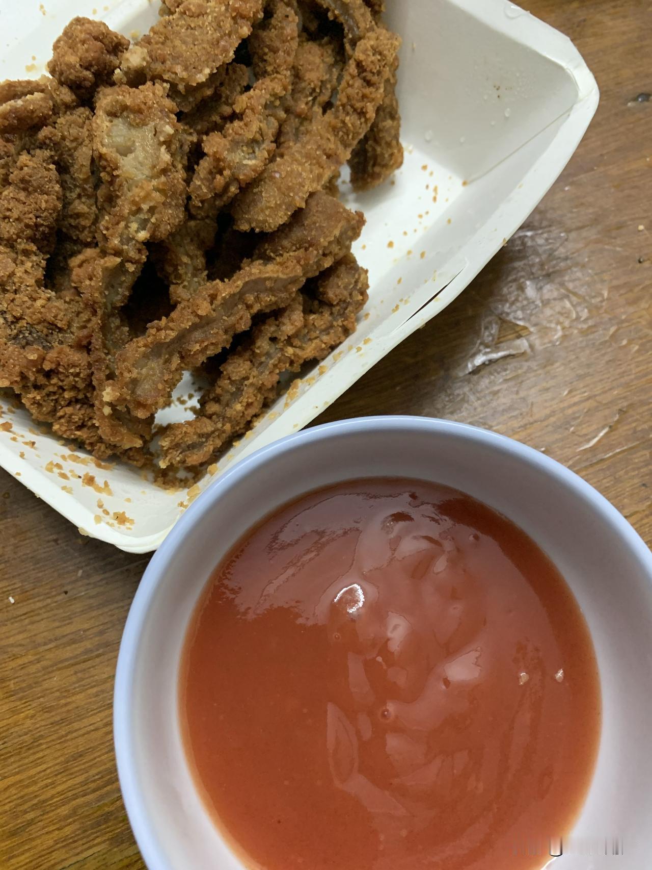 今晚降温了,不高兴自己动手做菜,去盛岸菜场买了点炸牛排,今天周末还好人不多,天冷的原因吧,等了十几分钟,真香啊,再炒个青菜就可以开饭了。