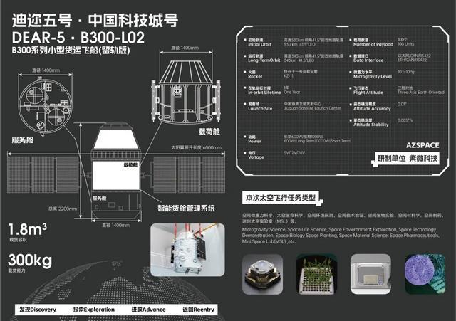 封面新闻记者从紫微科技公司了解到,此次成功发射的迪迩五号(B300-L02)是B300系列小型货运飞船的第二次执行发射任务,其具备300kg级载货能力与1.8立方米舱内空间,发射轨道高度530km,长期运行在高度343km、倾角41.5度的近地圆轨道。